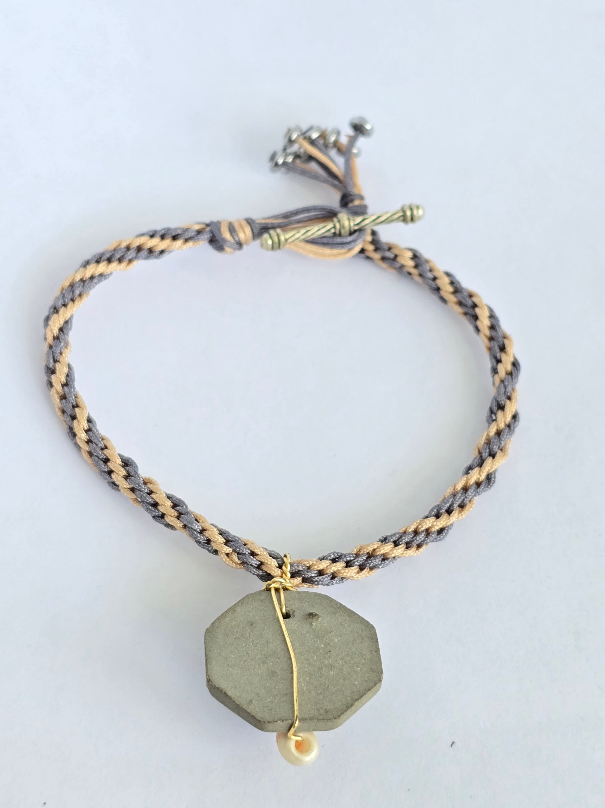 Pulsera en un delicado tonos crema y gris , tejida a mano en macramé para un acabado artesanal y elegante. Al centro, un charm en cemento con un bead alambrado cuidadosamente integrado, que añade textura, brillo y un detalle único al diseño.