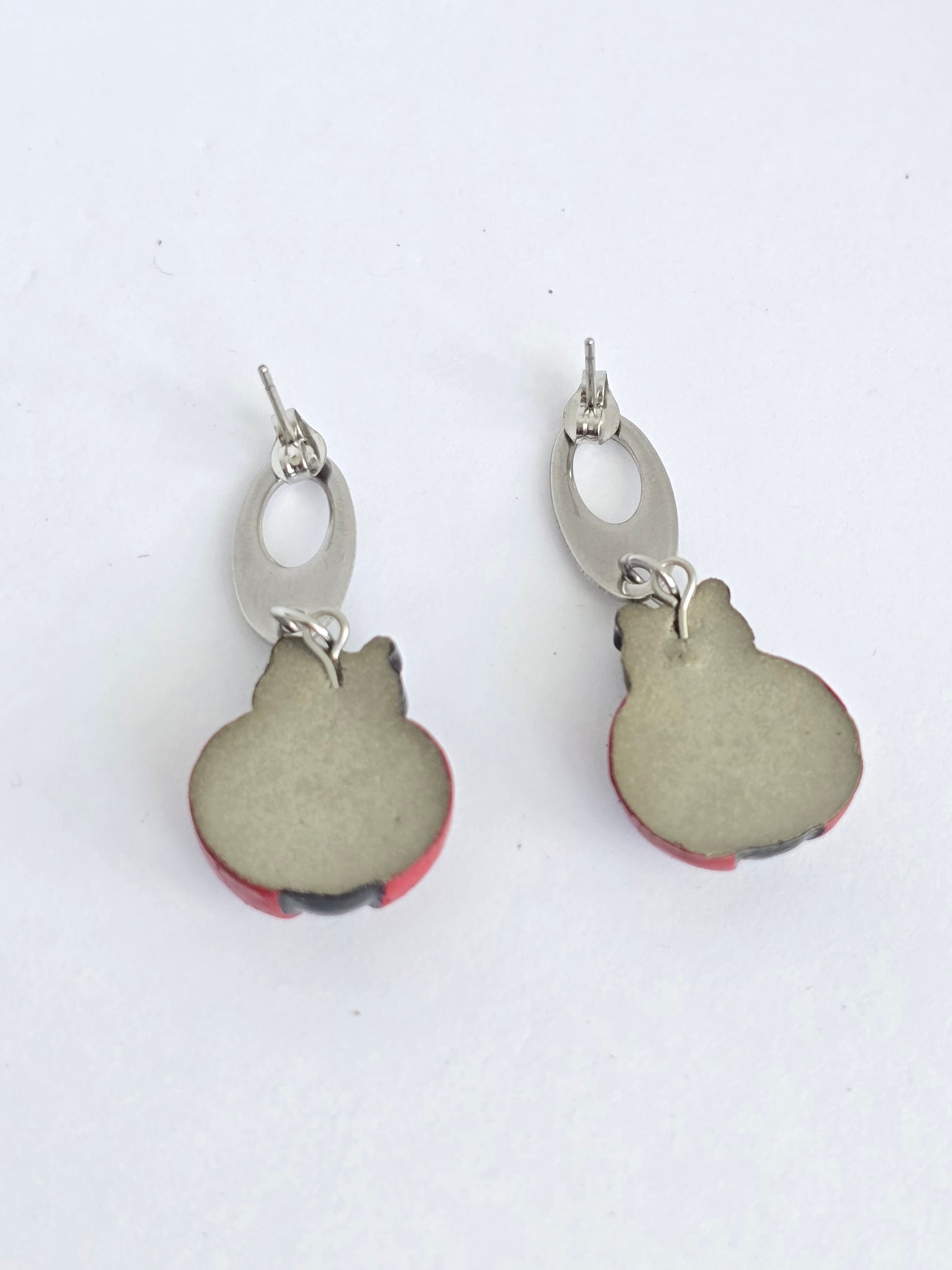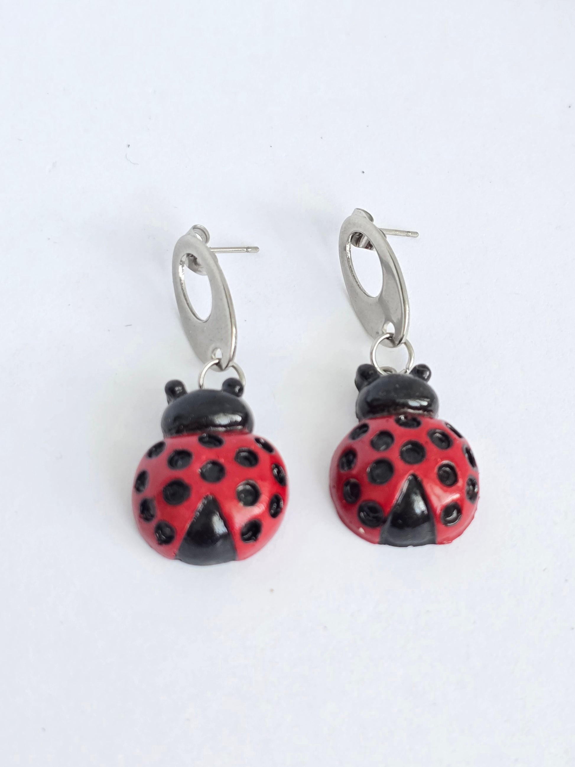 Pequeñas pero llenas de personalidad, estas pantallas en forma de mariquita están hechas en cemento y pintadas a mano en los clásicos tonos rojo y negro, con un toque tierno y vibrante. Su diseño pegadito las hace ideales para el uso diario, añadiendo un detalle juguetón y único a tu estilo. Cuelgan de ganchos en acero inoxidable, perfectos para quienes buscan piezas cómodas, livianas y con un toque natural artesanal.