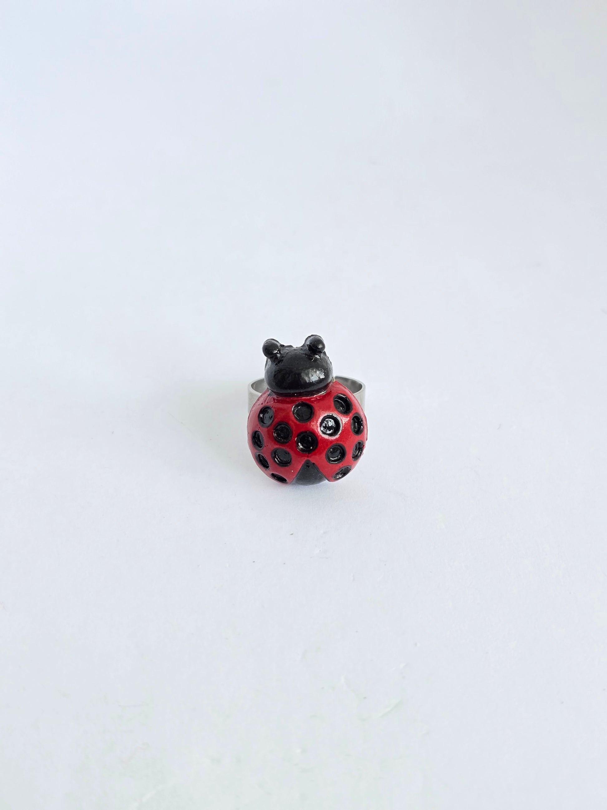 Sortija ajustable en acero inoxidable con una encantadora mariquita en cemento, pintada a mano con detalles vivos y alegres. Un símbolo de buena suerte y alegría, perfecta para quienes aman los toques divertidos y únicos en sus accesorios.
