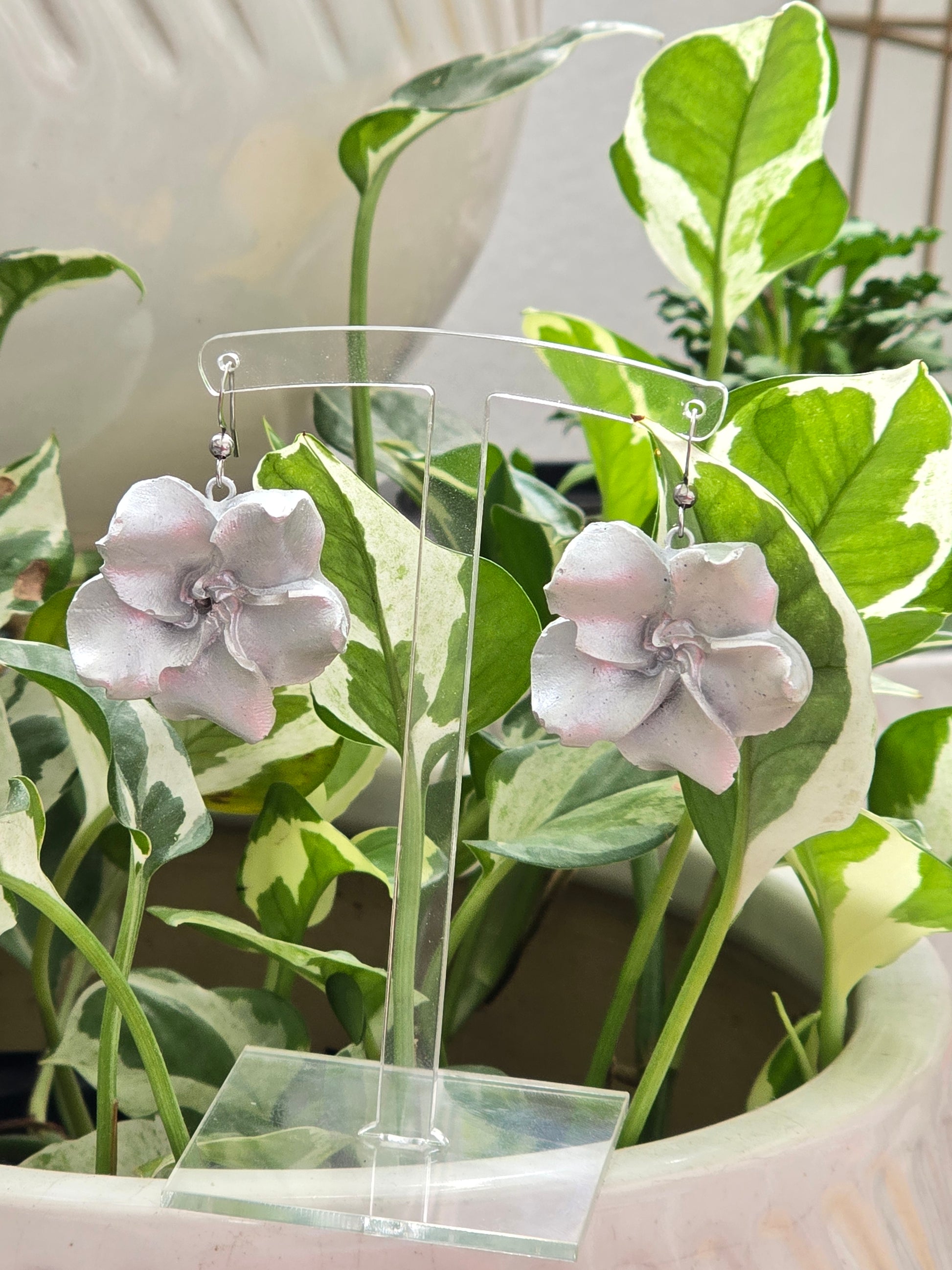 Estos aretes resaltan por su diseño minimalista y acabado brillante. Cada flor está moldeada en cemento y pintada a mano en un tono blanco metálico que aporta un toque moderno y elegante. Los ganchos son de acero inoxidable, garantizando durabilidad y comodidad. Una pieza versátil y artesanal, perfecta para complementar cualquier estilo con sutileza y distinción. 🤍🌸
