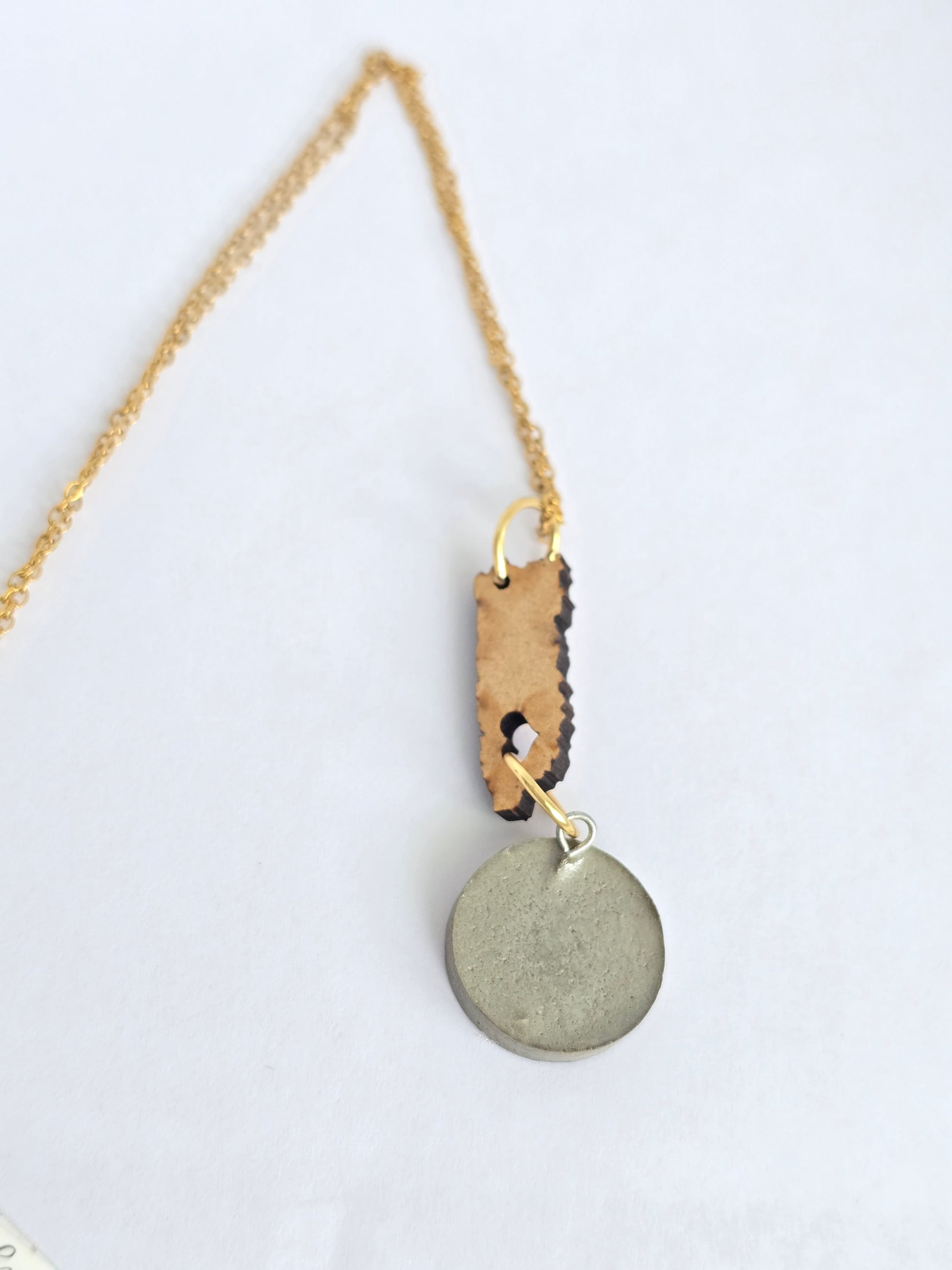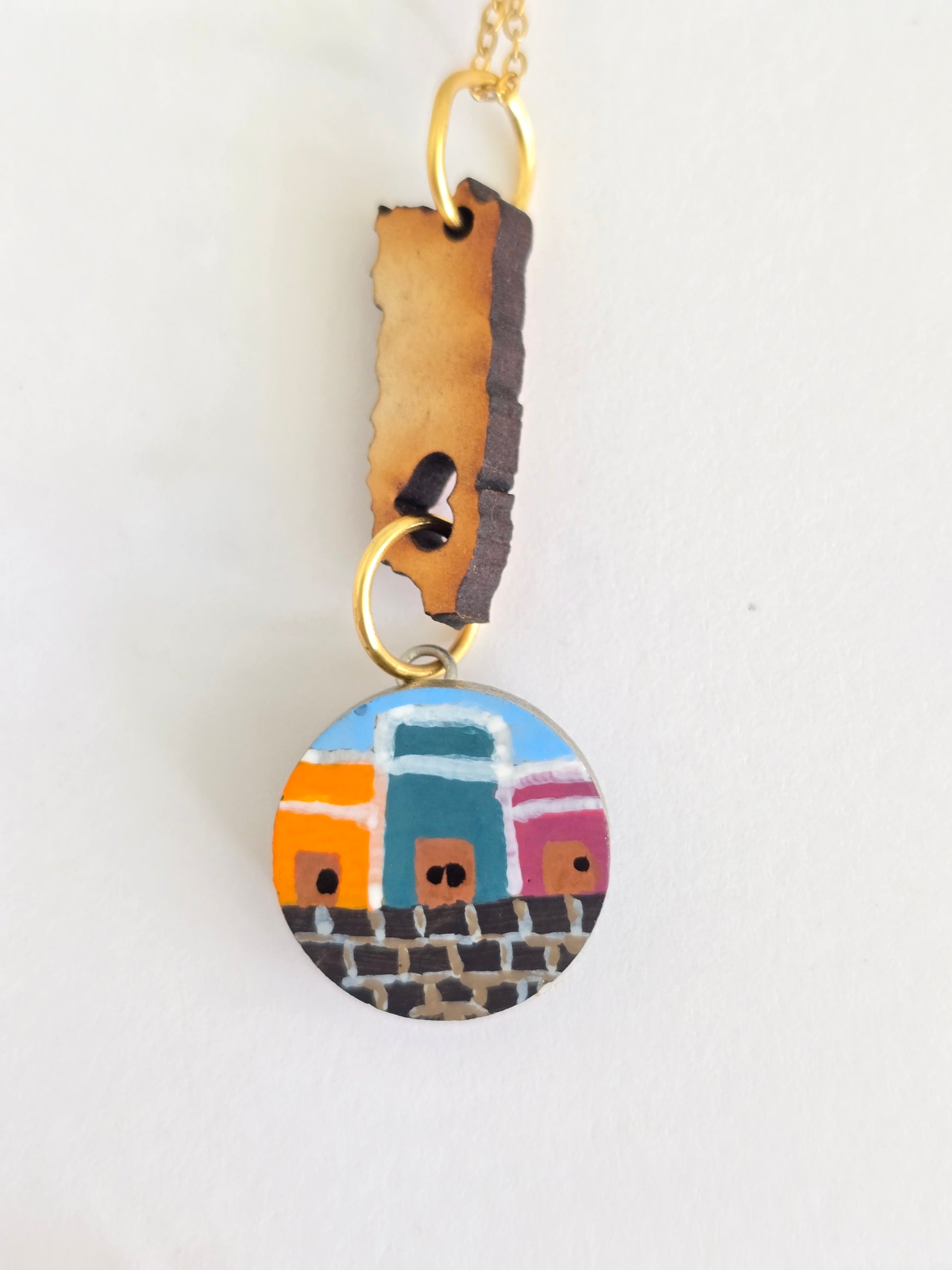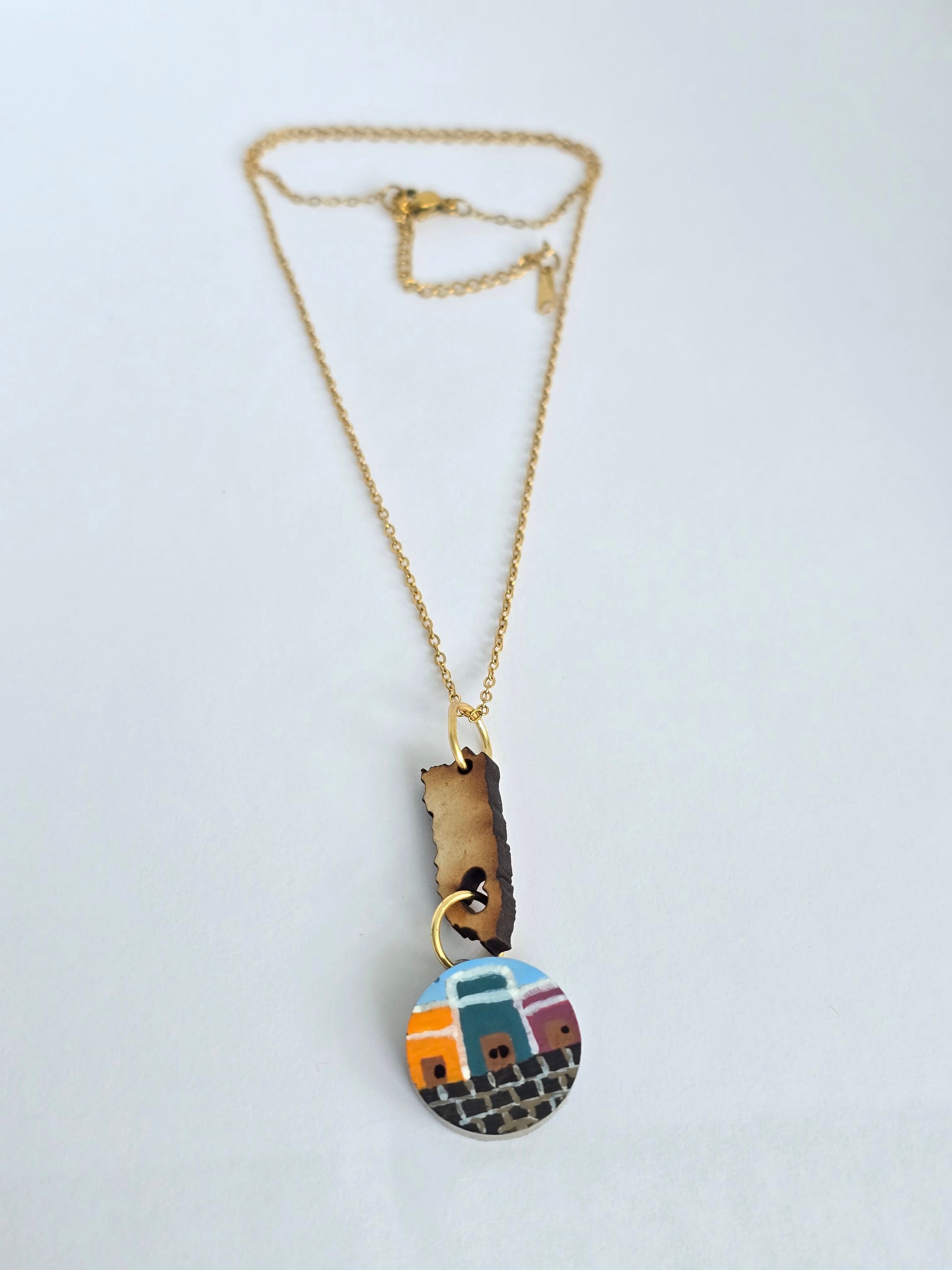 Este collar celebra el encanto del Viejo San Juan con un mapa de Puerto Rico en madera, del cual cuelga un charm circular en cemento pintado a mano con las icónicas casitas coloridas de la ciudad. Cada detalle refleja la alegría y la historia de nuestras calles empedradas. Con cadena en acero inoxidable, es una pieza resistente y llena de identidad cultural.