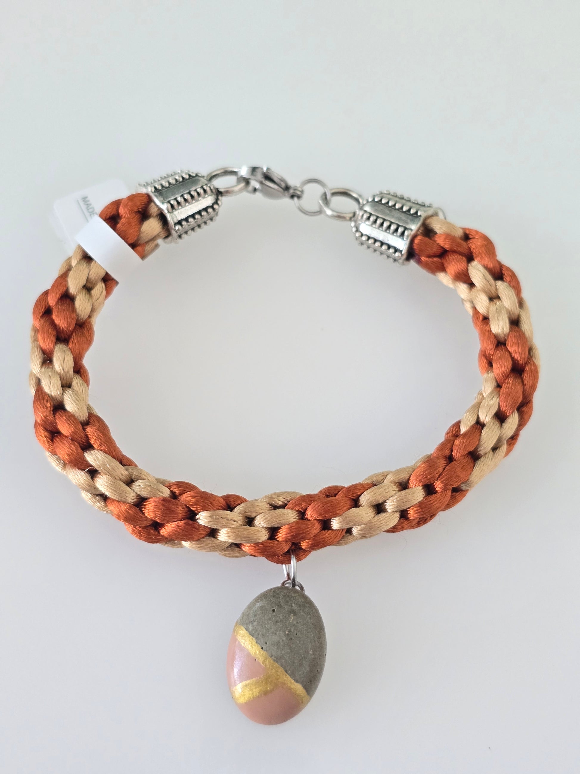 Una pieza que combina calidez y sencillez en un diseño artesanal. Su trenza en tonos crema y anaranjado oscuro resalta un charm ovalado en cemento pintado con un estilo minimalista. Ligera y moderna, es perfecta para quienes buscan un toque artesanal con elegancia natural. Material: Cemento y cordón trenzado