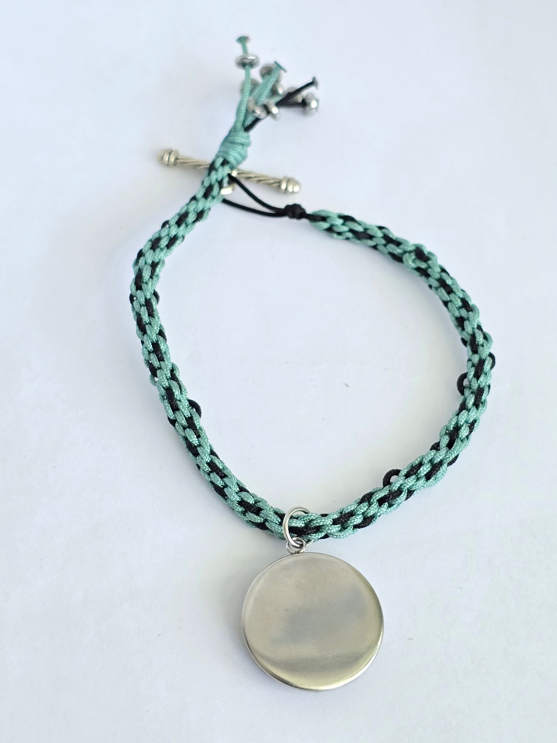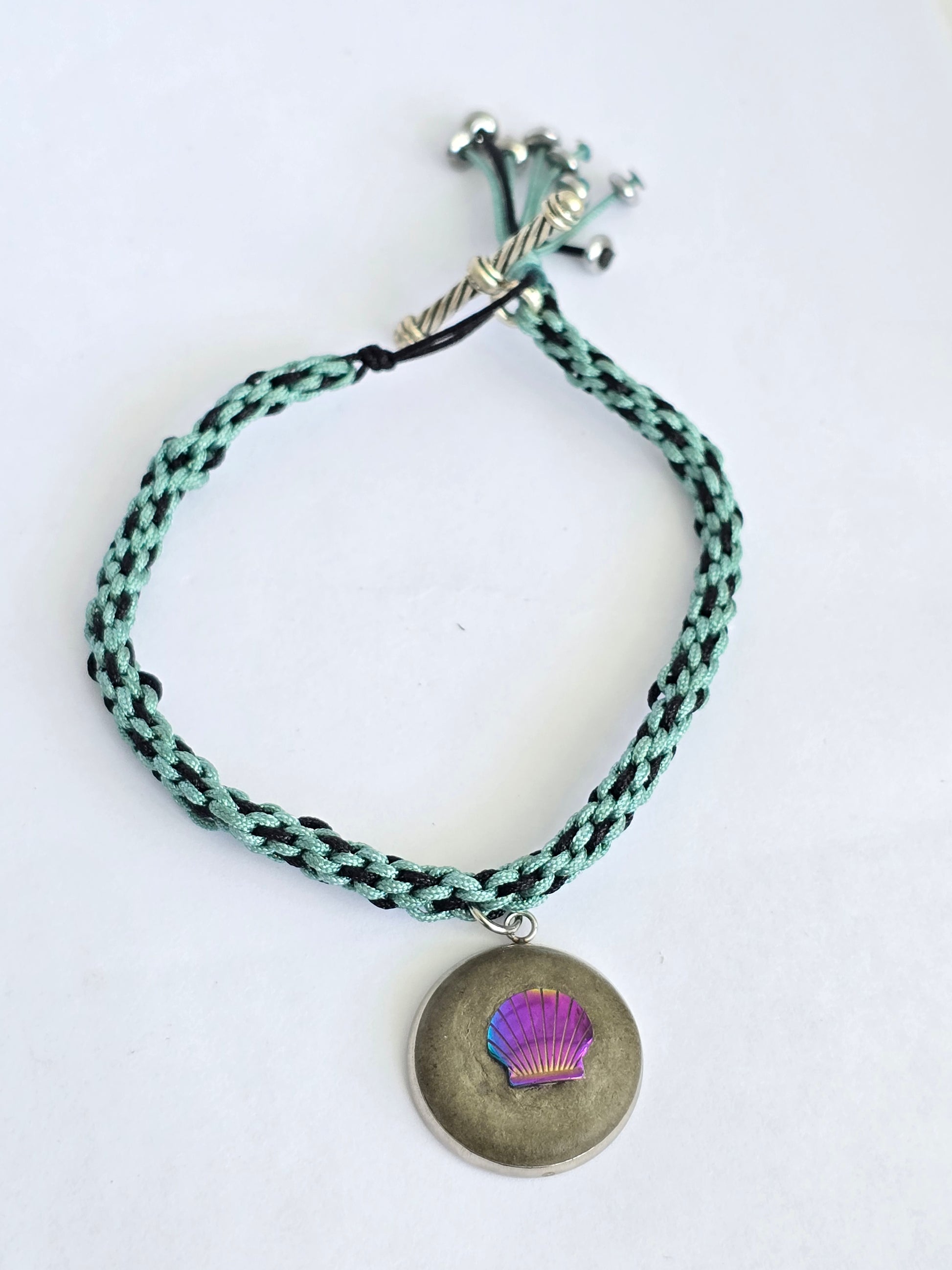 Pulsera tejida a mano en un hermoso diseño de macramé, con hilo y detalles cuidadosamente elaborados. Al centro, una chapa en acero inoxidable rellena de cemento que sostiene un caracol tornasol, que refleja la luz con matices mágicos y naturales.