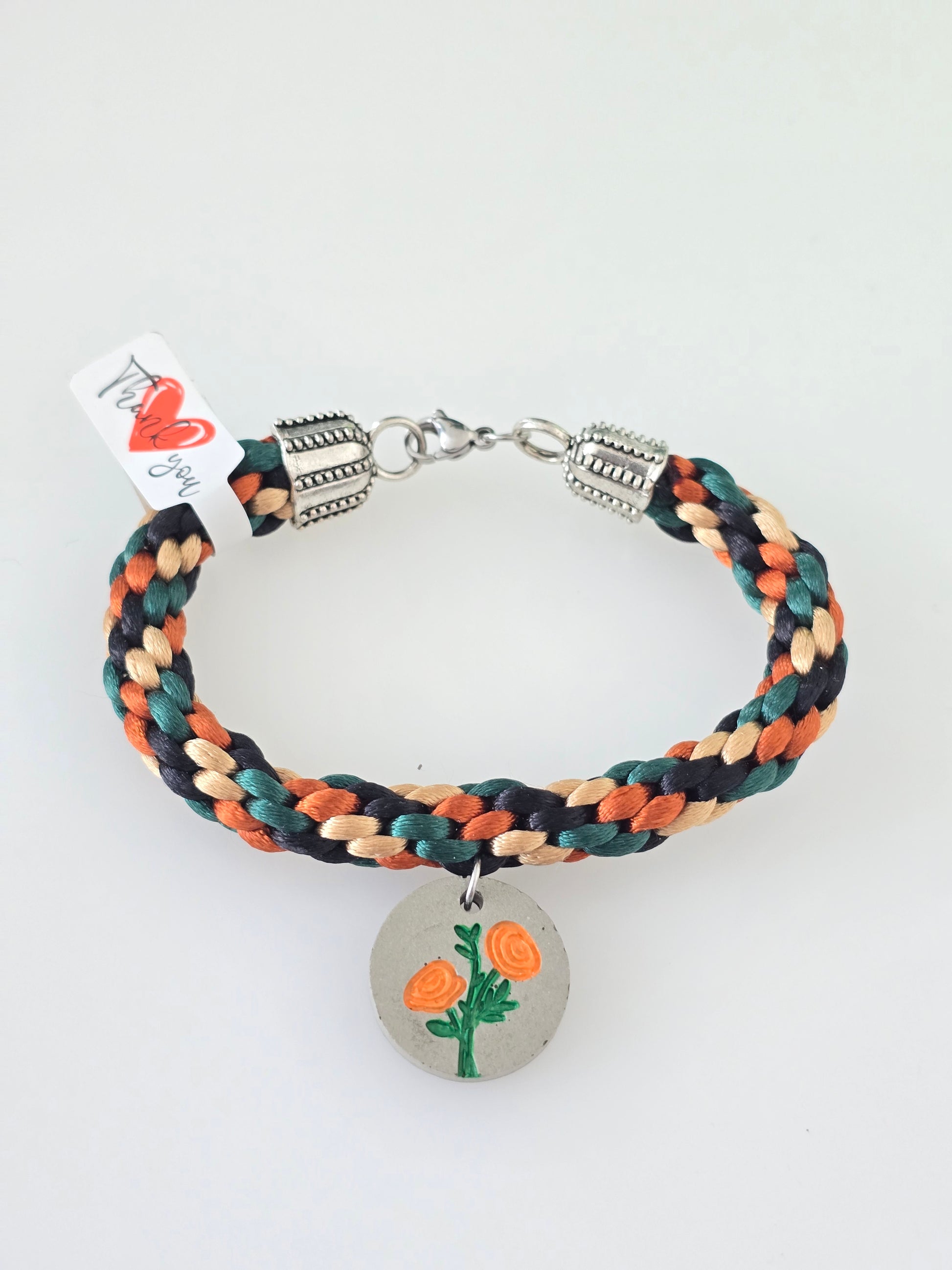Una pieza llena de carácter y arte. Su trenza combina tonos negro, crema, verde oscuro y anaranjado, evocando la belleza natural del bosque tropical. En el centro, una chapa artesanal en cemento decorada con delicadas flores anaranjadas añade el toque perfecto de color y textura. Sus terminales plateados completan el diseño con elegancia.