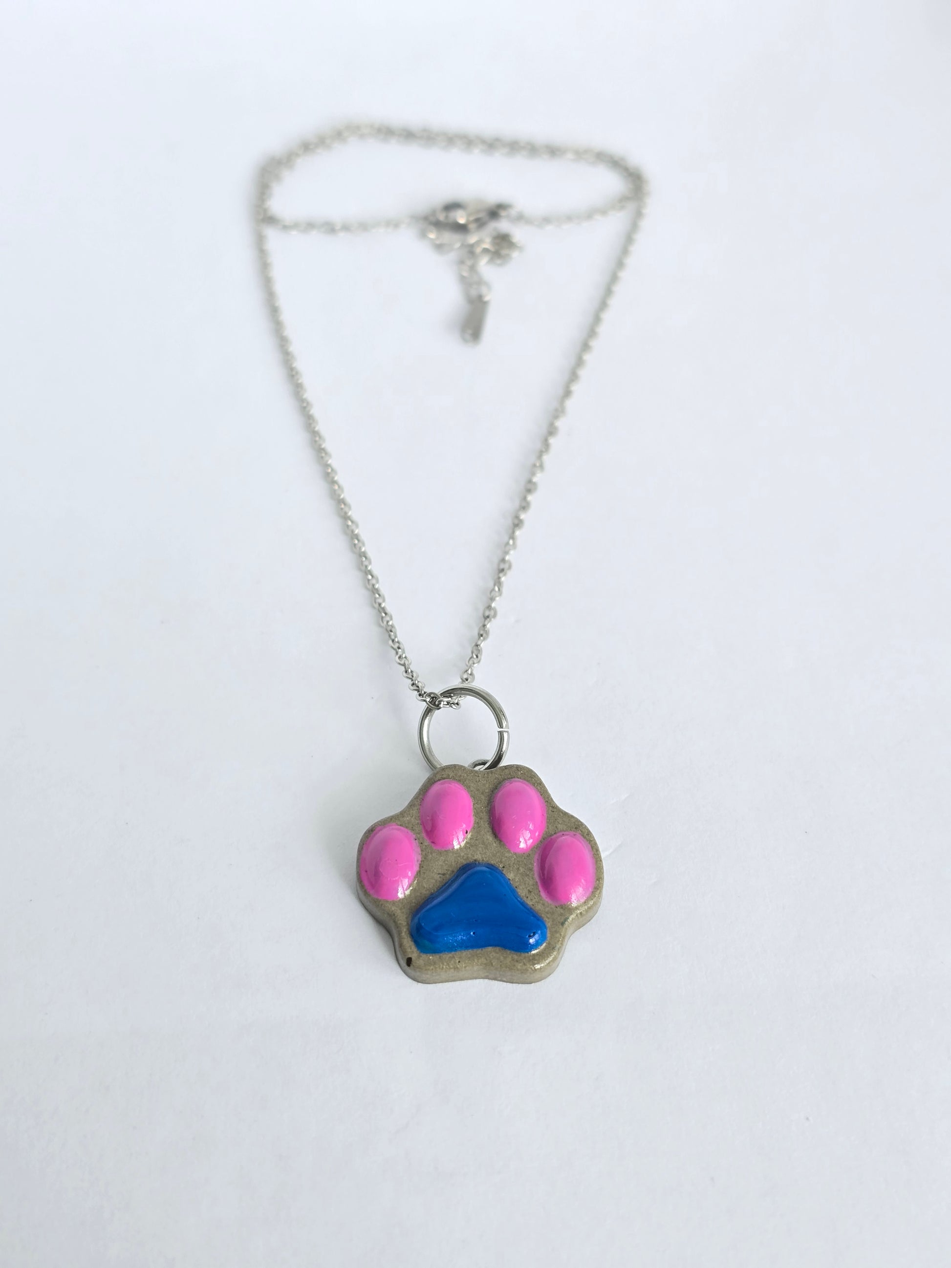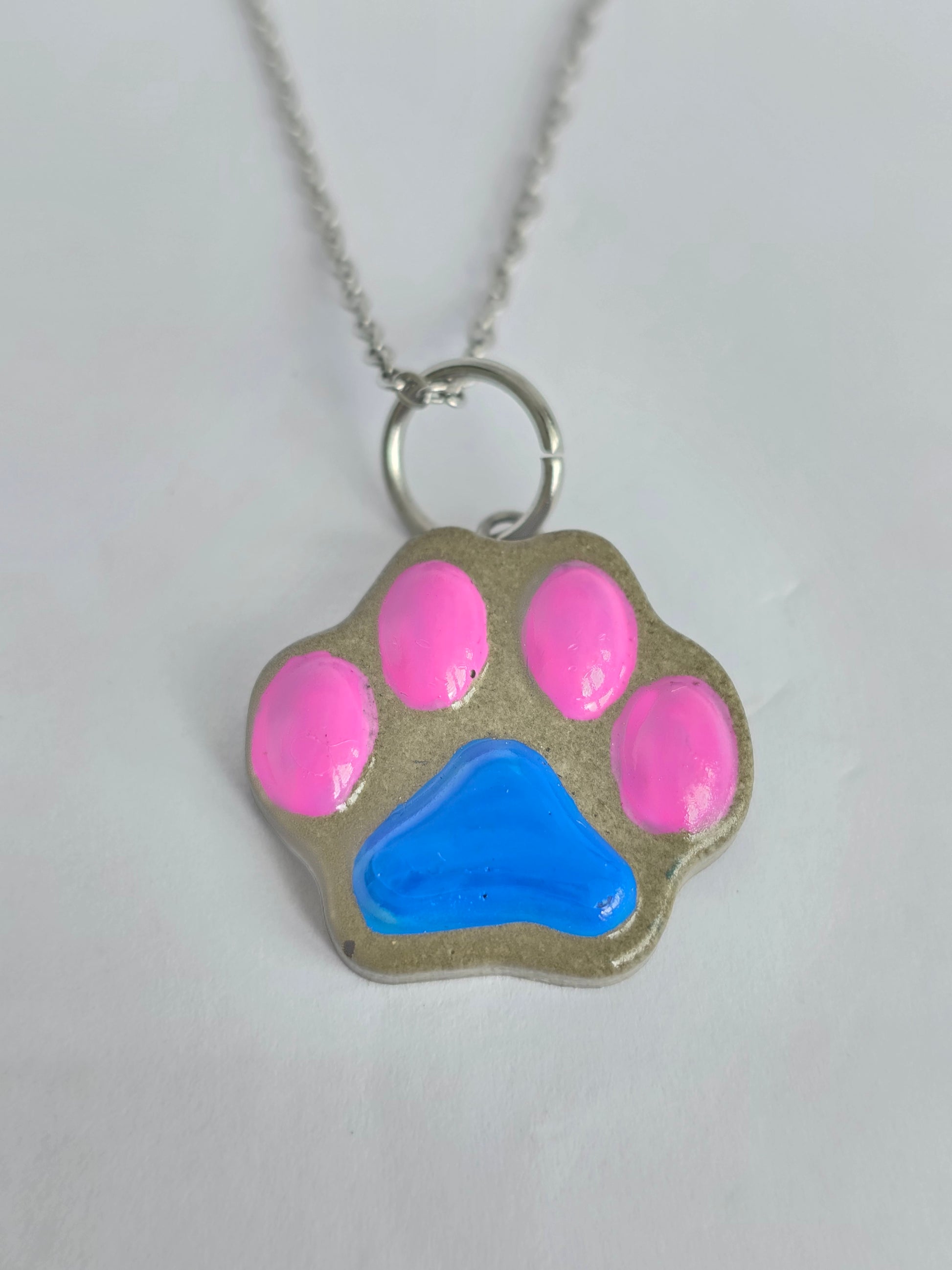 Colgante en forma de huella, hecho en cemento y pintado a mano en tonos azul y rosa. Un diseño tierno y artesanal que celebra el amor por los perritos. Cadena en acero inoxidable, resistente y perfecta para uso diario. Ideal para quienes llevan en el corazón a su mejor amigo peludo.