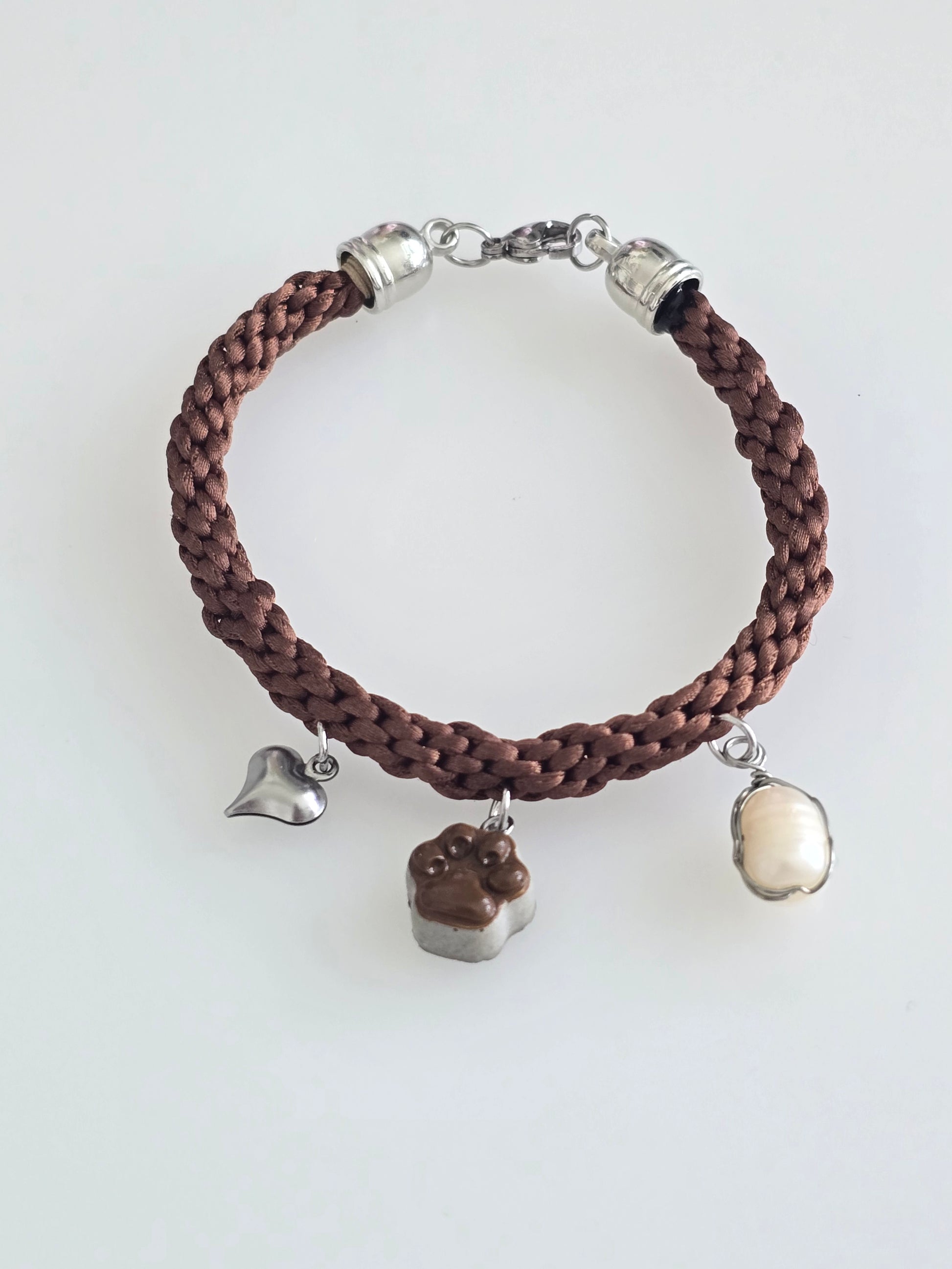 Pulsera trenza artesanal marrón con huellita de perro en cemento, corazón en acero inoxidable y perla de agua dulce envuelta en alambre, un accesorio único hecho a mano lleno de estilo y personalidad.