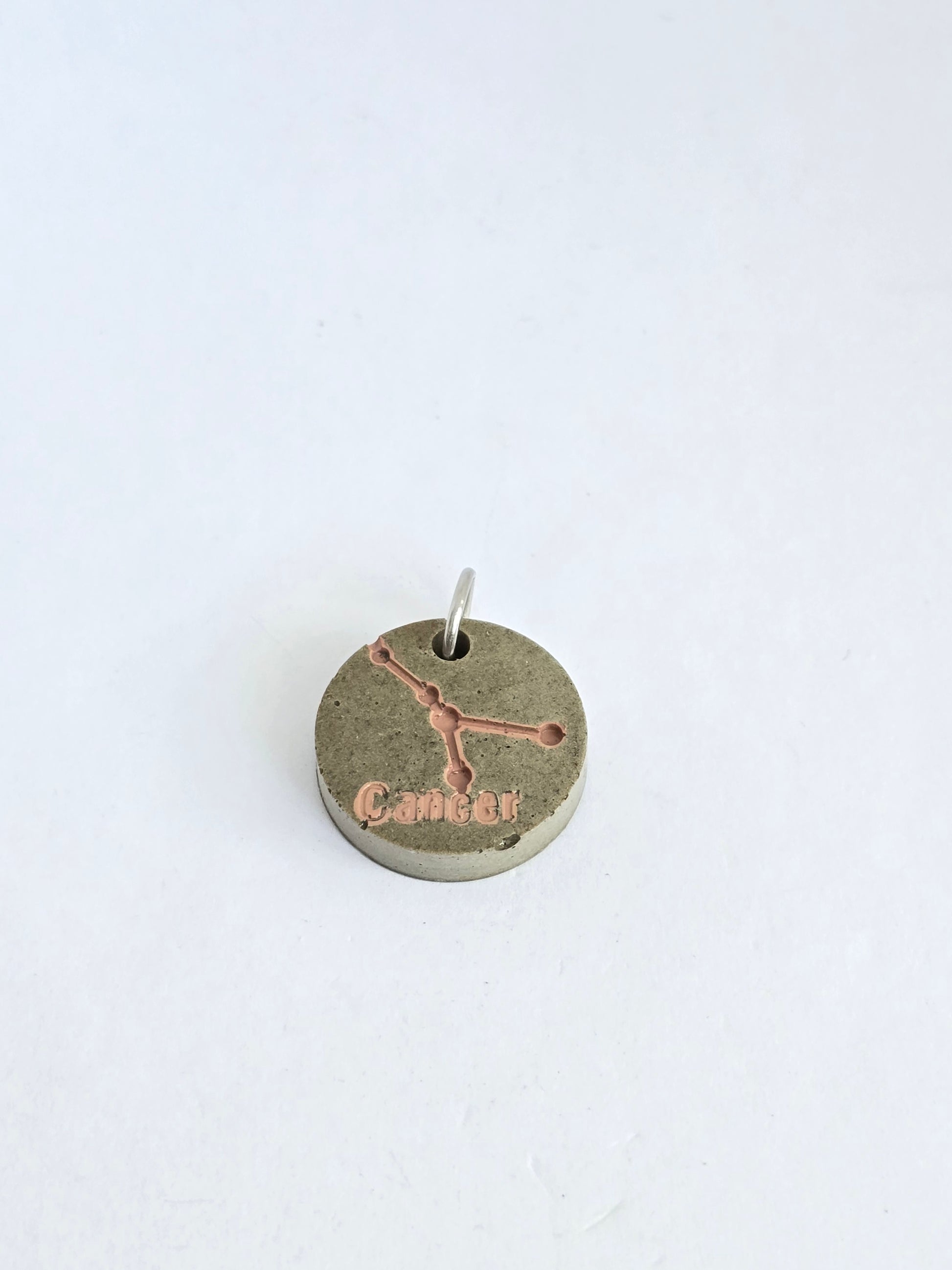 Charm del signo Cáncer, moldeado en cemento y pintado a mano en tono rosado. Un diseño con significado personal, perfecto para representar tu energía zodiacal en collares, pulseras o llaveros.