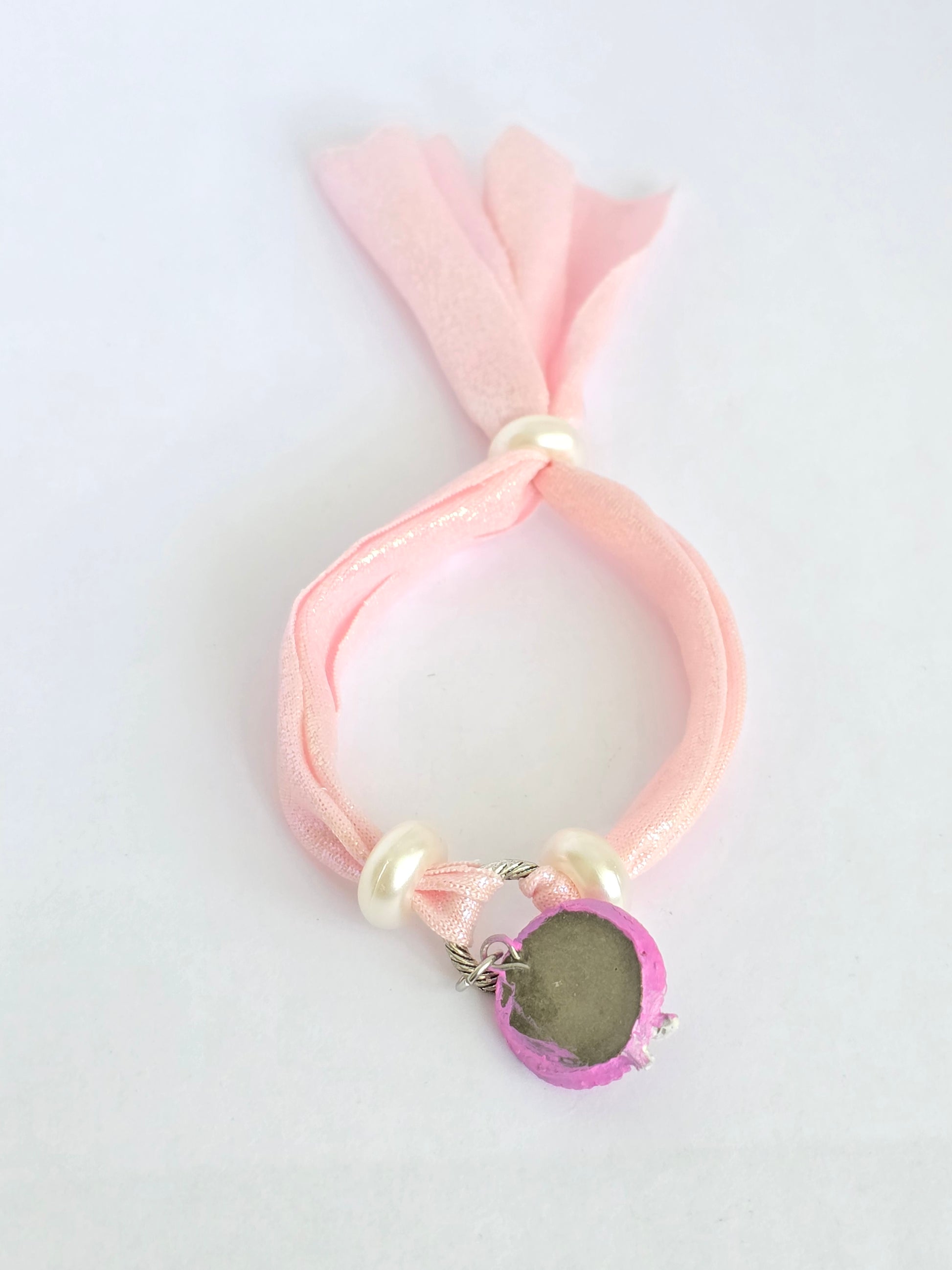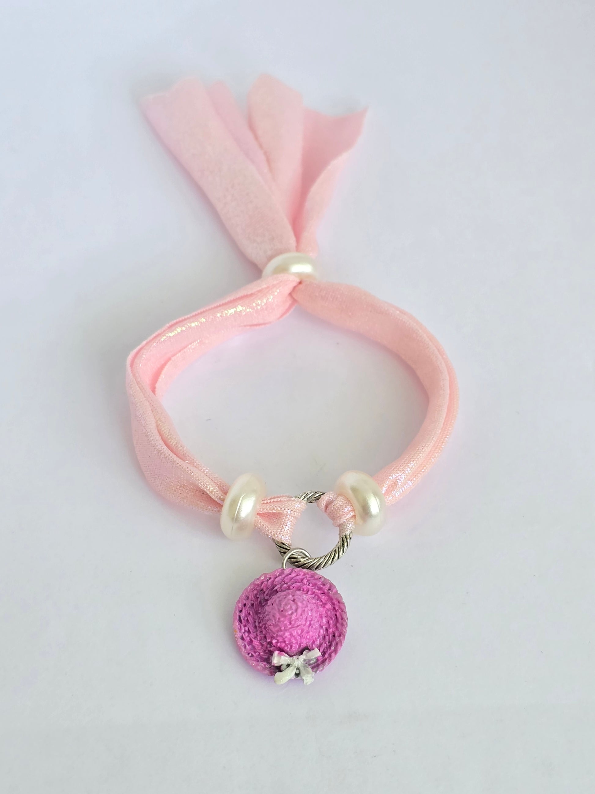 Pulsera ajustable en licra suave y elástica, ideal para un uso cómodo y diario. En el centro, un charm en cemento pintado a mano en forma de gorro rosado, que aporta un toque divertido, único y lleno de color.