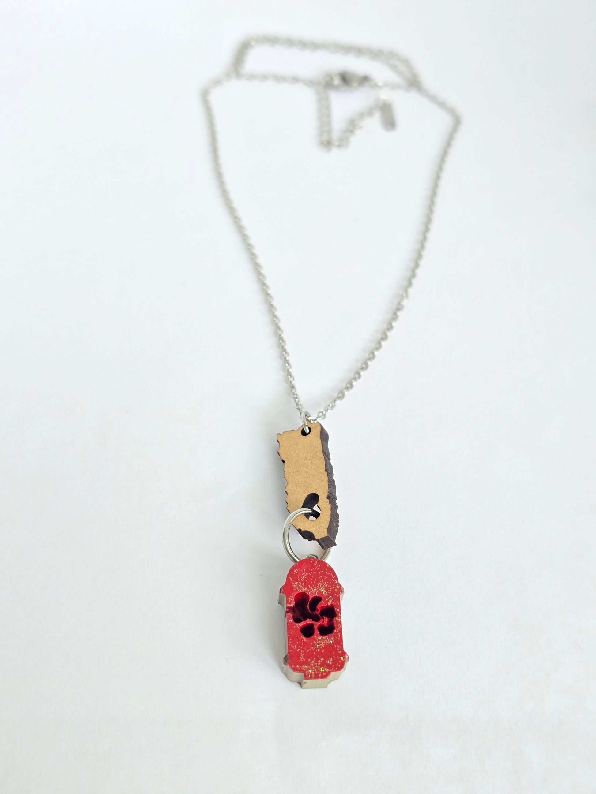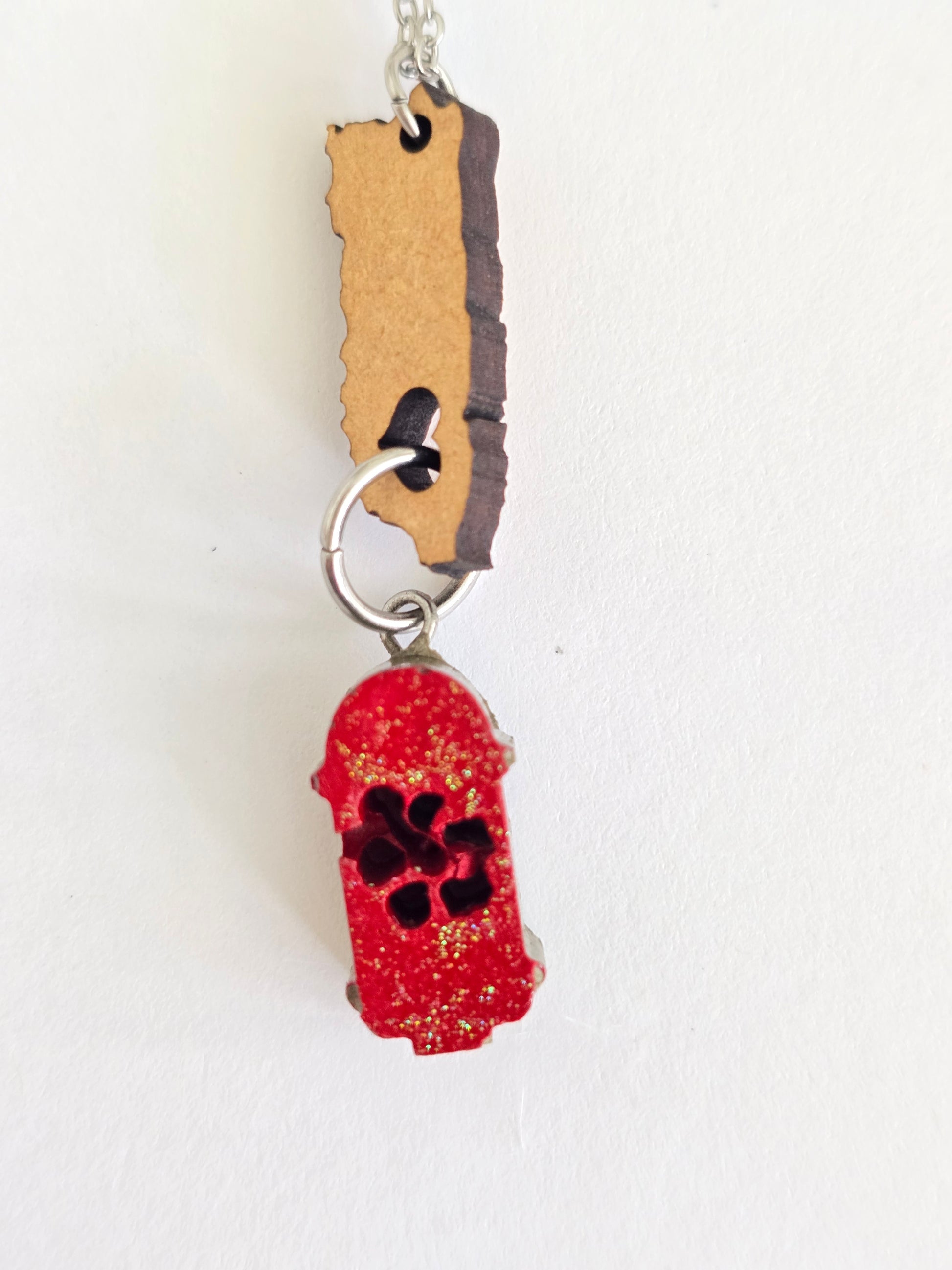 Un homenaje a nuestra historia y belleza natural: mapa de Puerto Rico en madera, del cual cuelga una garita de San Juan pintada en rojo, con una delicada amapola en su interior. Esta pieza artesanal mezcla orgullo patrio con elementos icónicos de nuestra isla. Viene con cadena en acero inoxidable, perfecta para llevar tu borinqueñidad con elegancia.