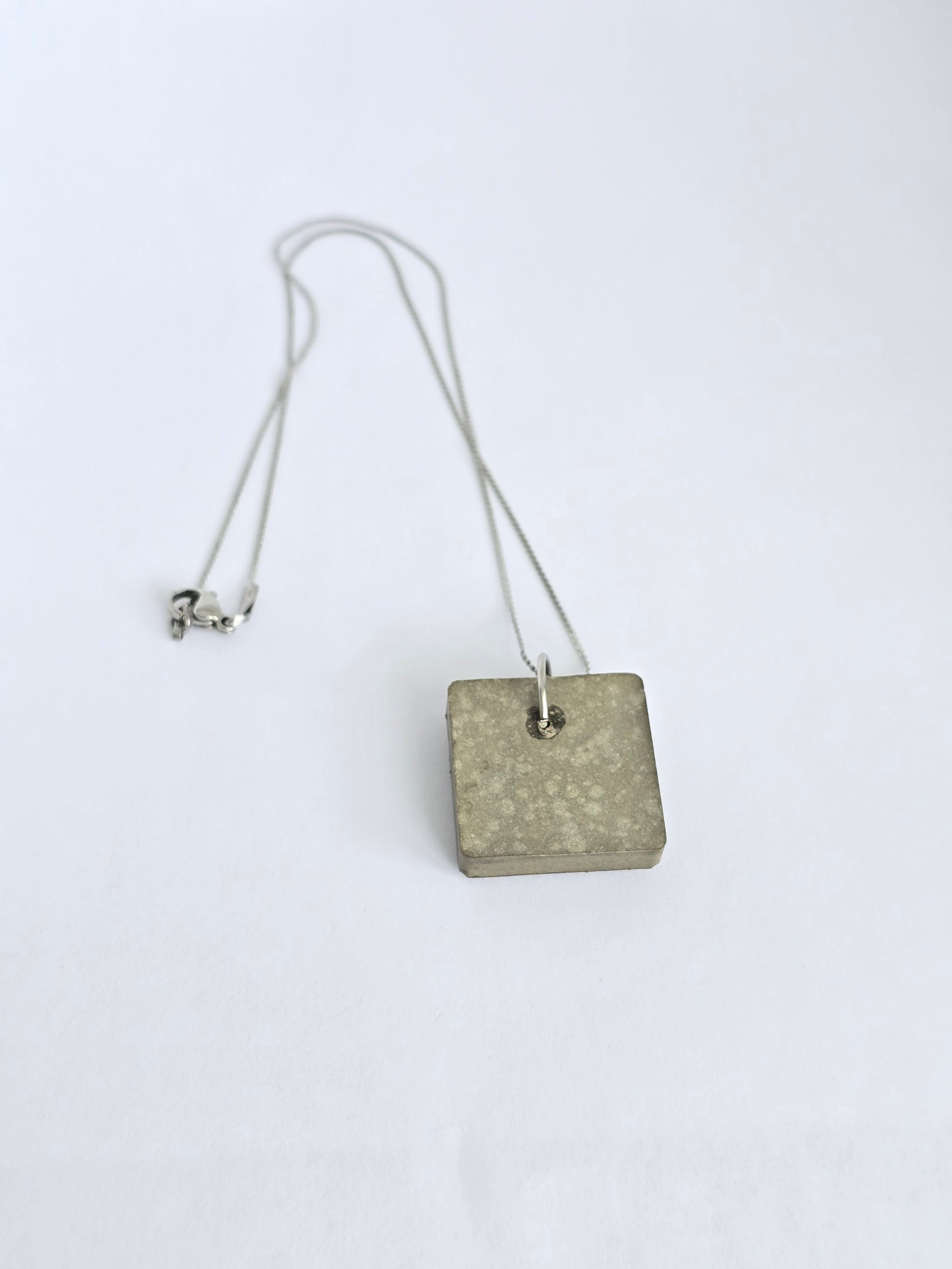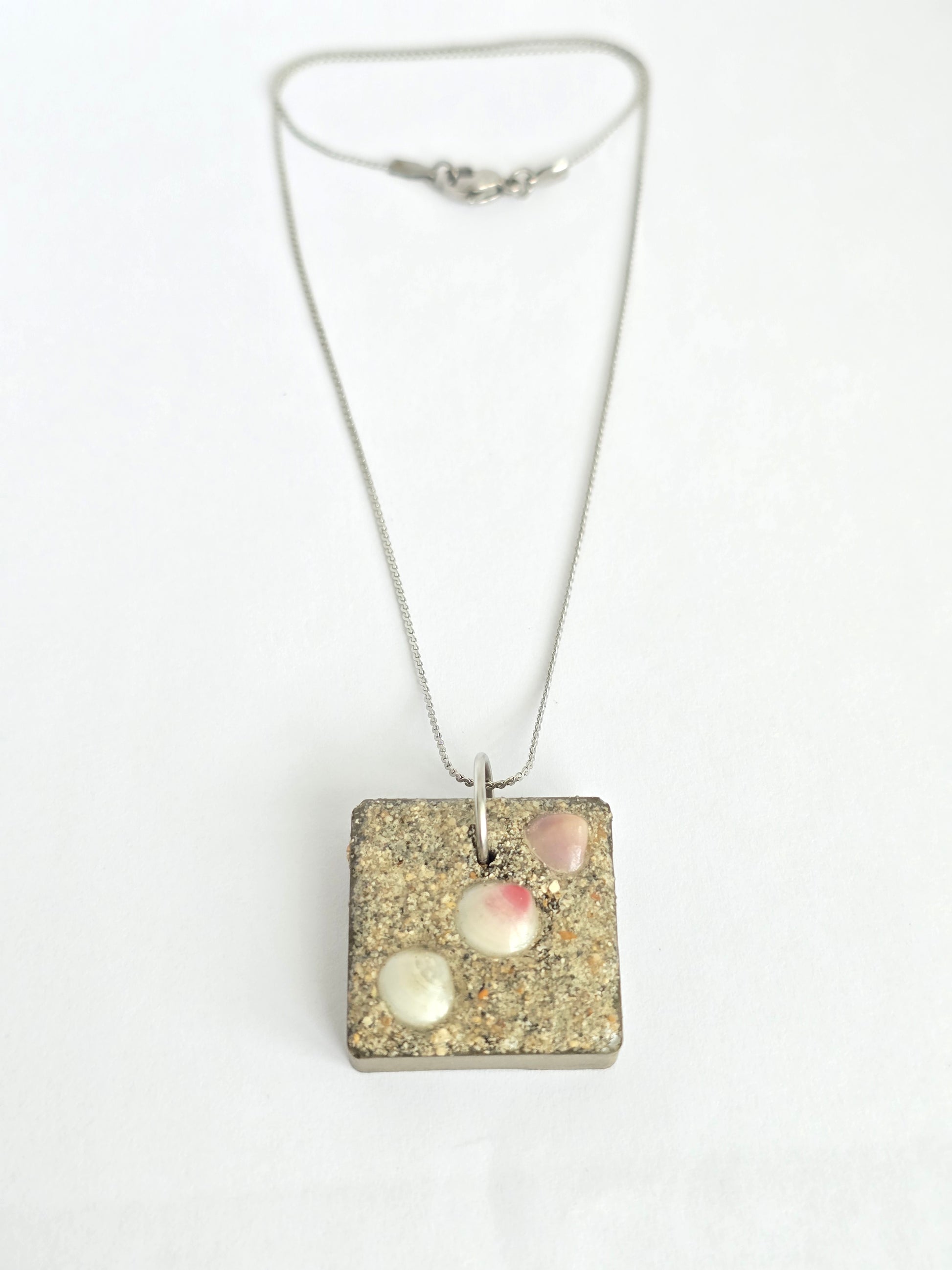 Collar con charm cuadrado en cemento con arena auténtica de la isla incrustada, acompañado de tres pequeños caracoles recogidos en la misma playa. Todo está cuidadosamente sellado en resina, preservando la belleza natural de Puerto Rico en una pieza única. Viene con cadena en acero inoxidable, perfecta para quienes quieren llevar consigo un pedacito real de la playa y el mar.