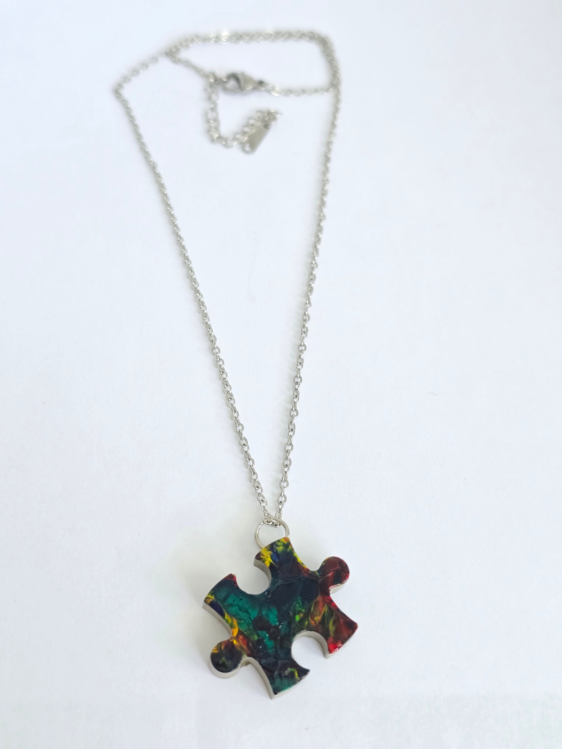 Colgante en forma de pieza de rompecabezas, hecho en cemento y pintado a mano con una mezcla de colores únicos. Cada pieza es distinta, reflejando autenticidad y creatividad. Cadena en acero inoxidable, perfecta para quienes aman lo diferente y valoran lo hecho a mano.