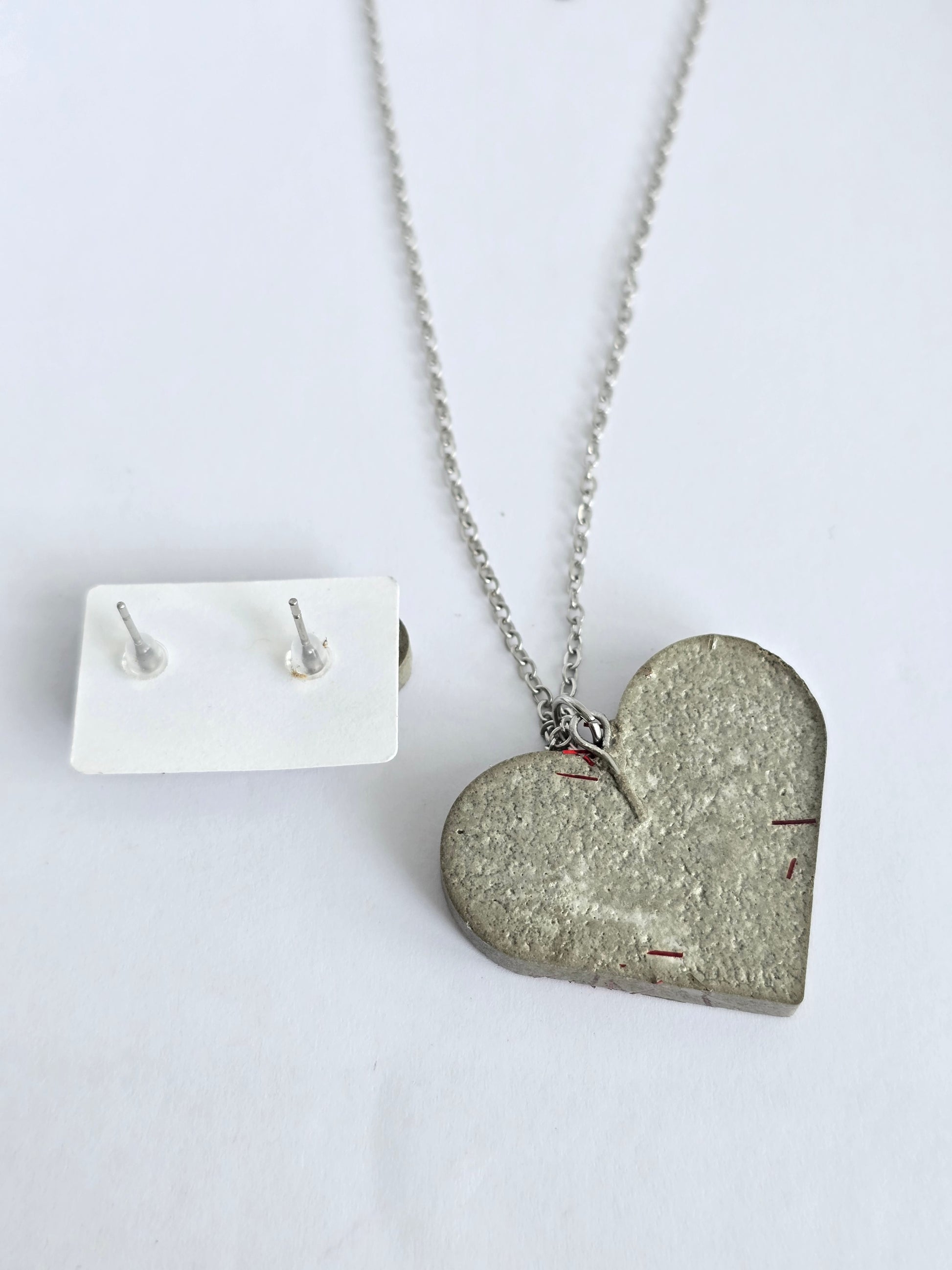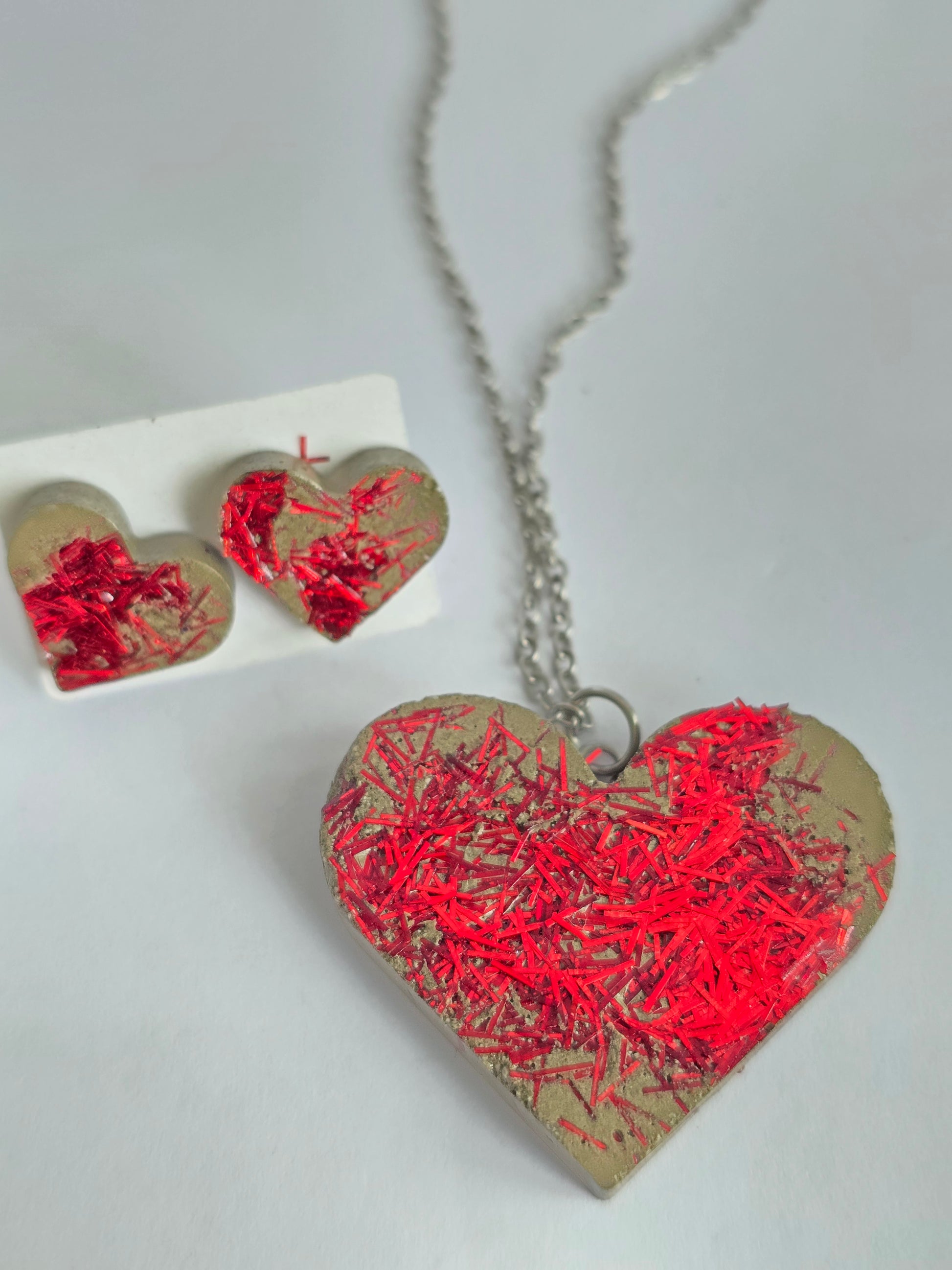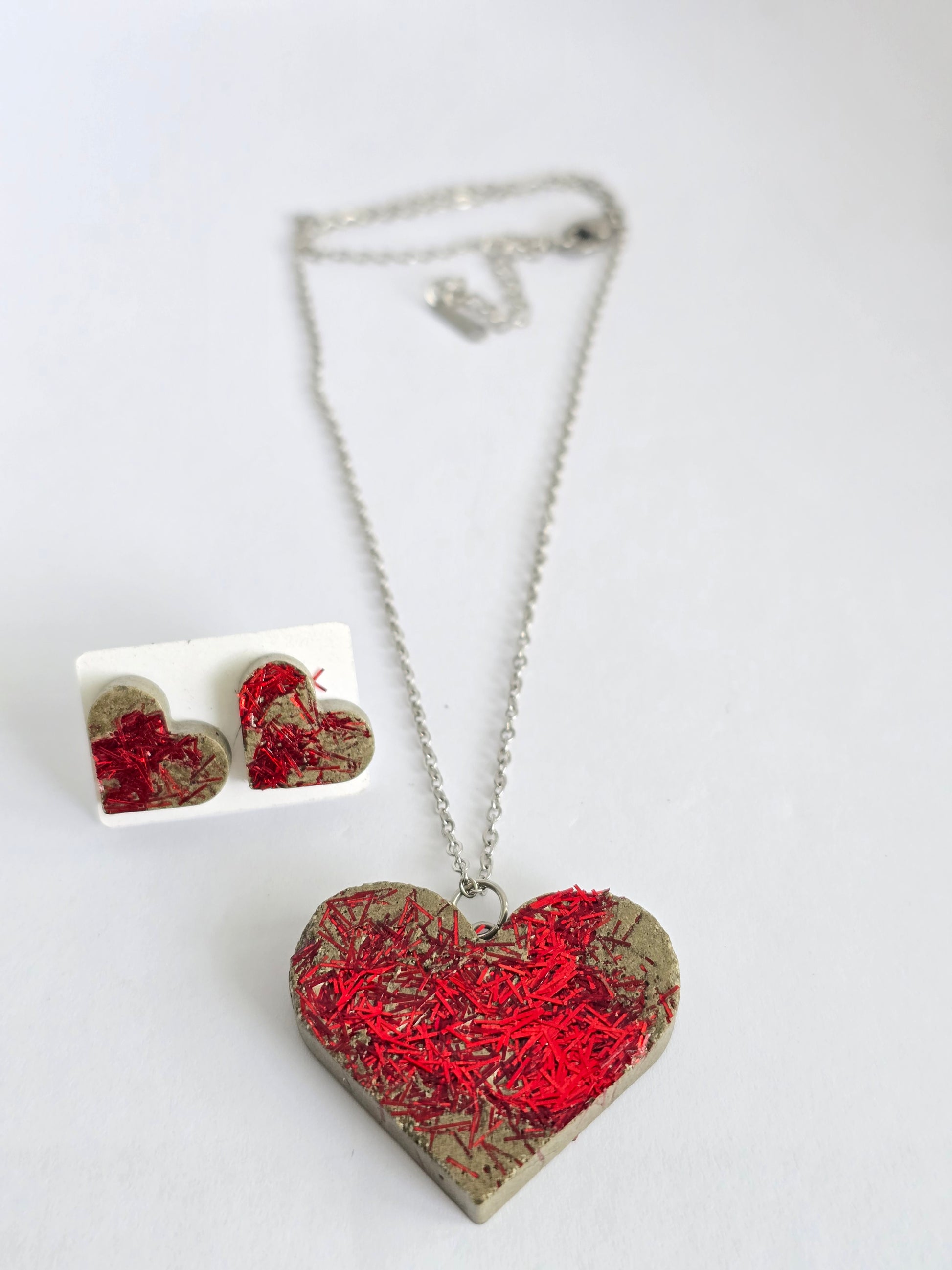 Set de collar y pantallas tipo studs, ambos en acero inoxidable. El colgante presenta un corazón de forma de corazón aplastado, decorado con un brillo rojo distinto que añade textura y personalidad. Una pieza moderna y delicada, ideal para destacar con un diseño fuera de lo común.