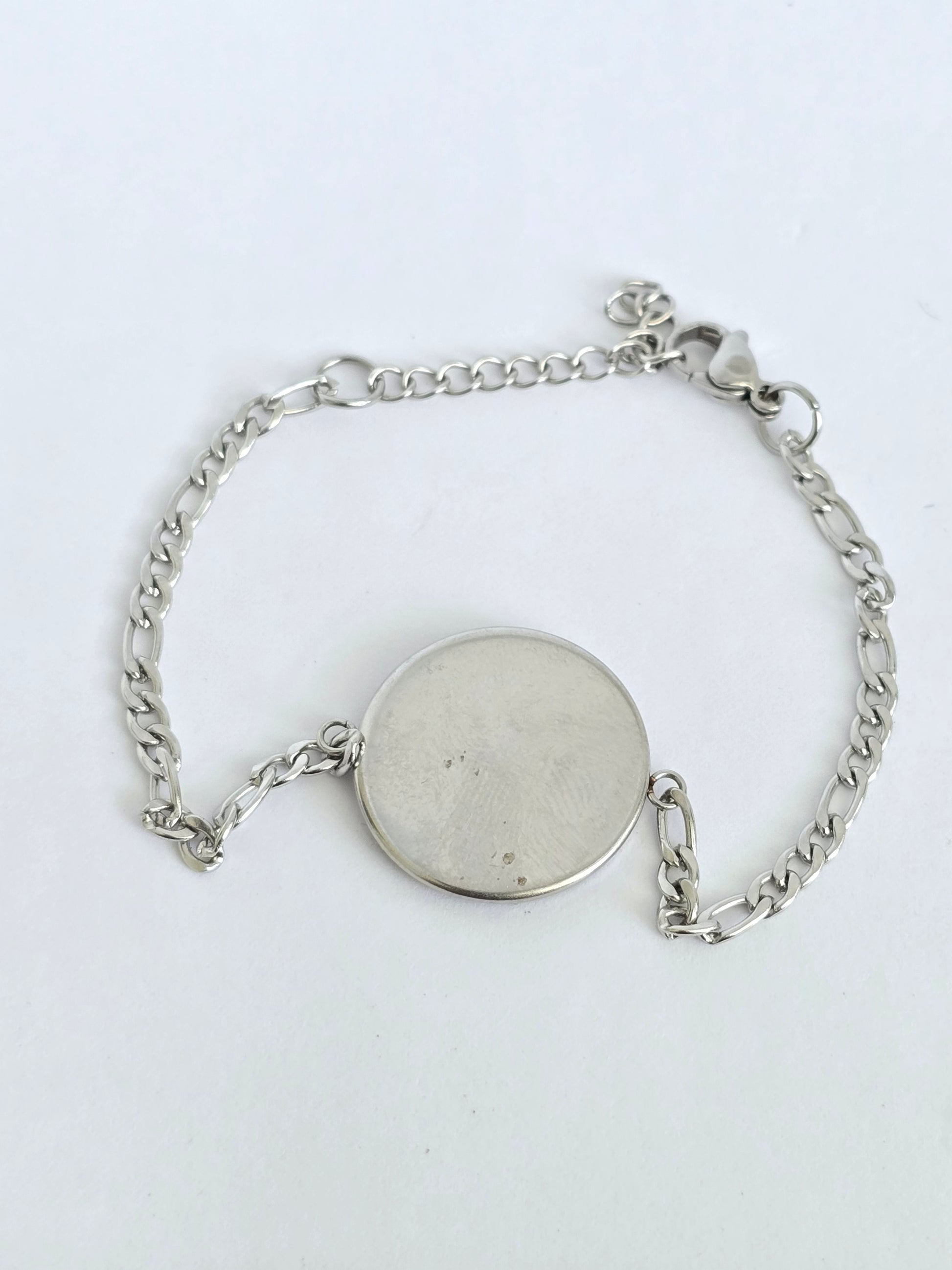 Pulsera con cadena elaborada de eslabones anchos en stainless steel, ideal para un look moderno y con carácter. Al centro, una chapa rellena de cemento con arena auténtica de playa de Puerto Rico, capturando un pedacito del paraíso para llevar contigo.