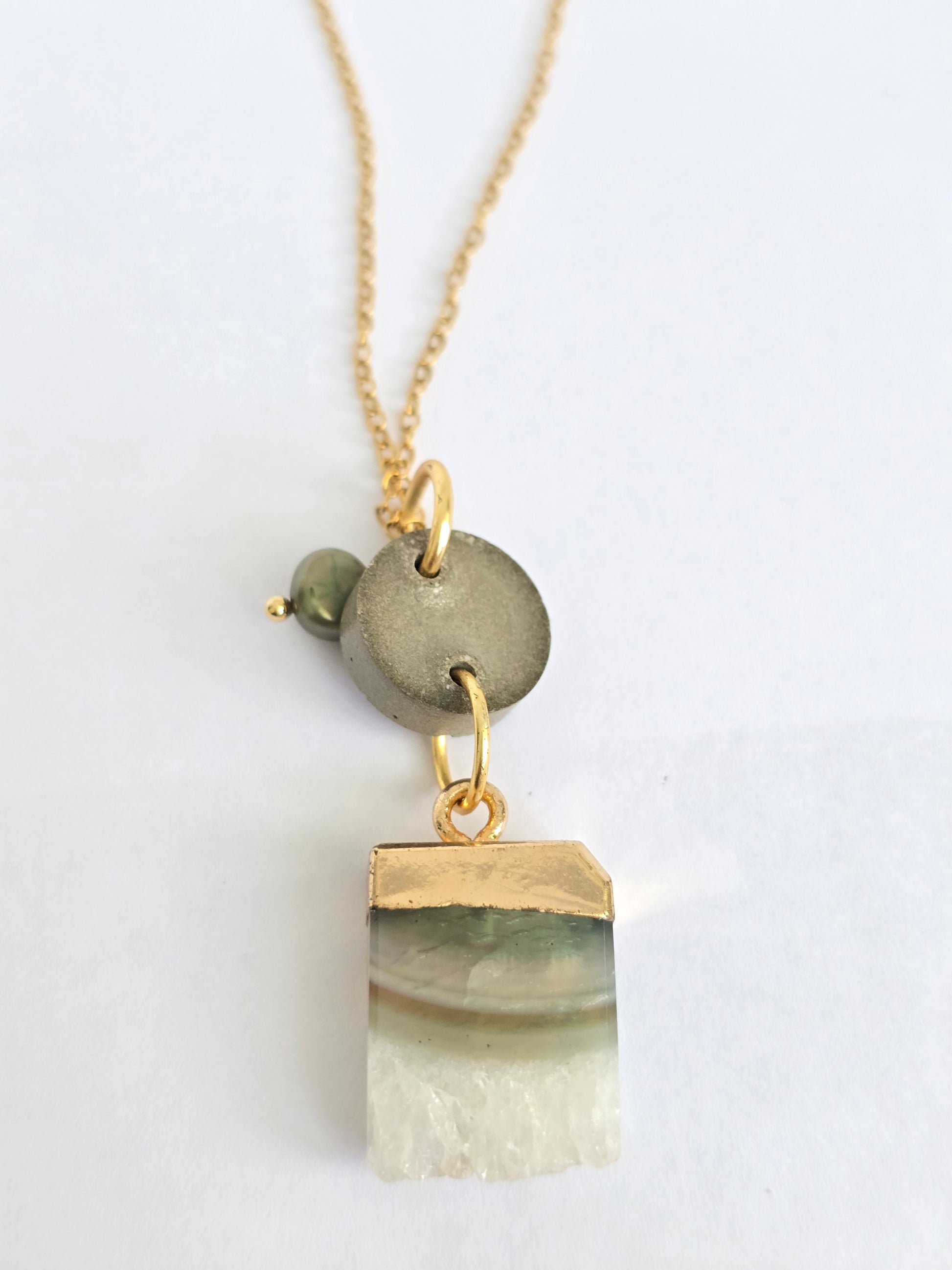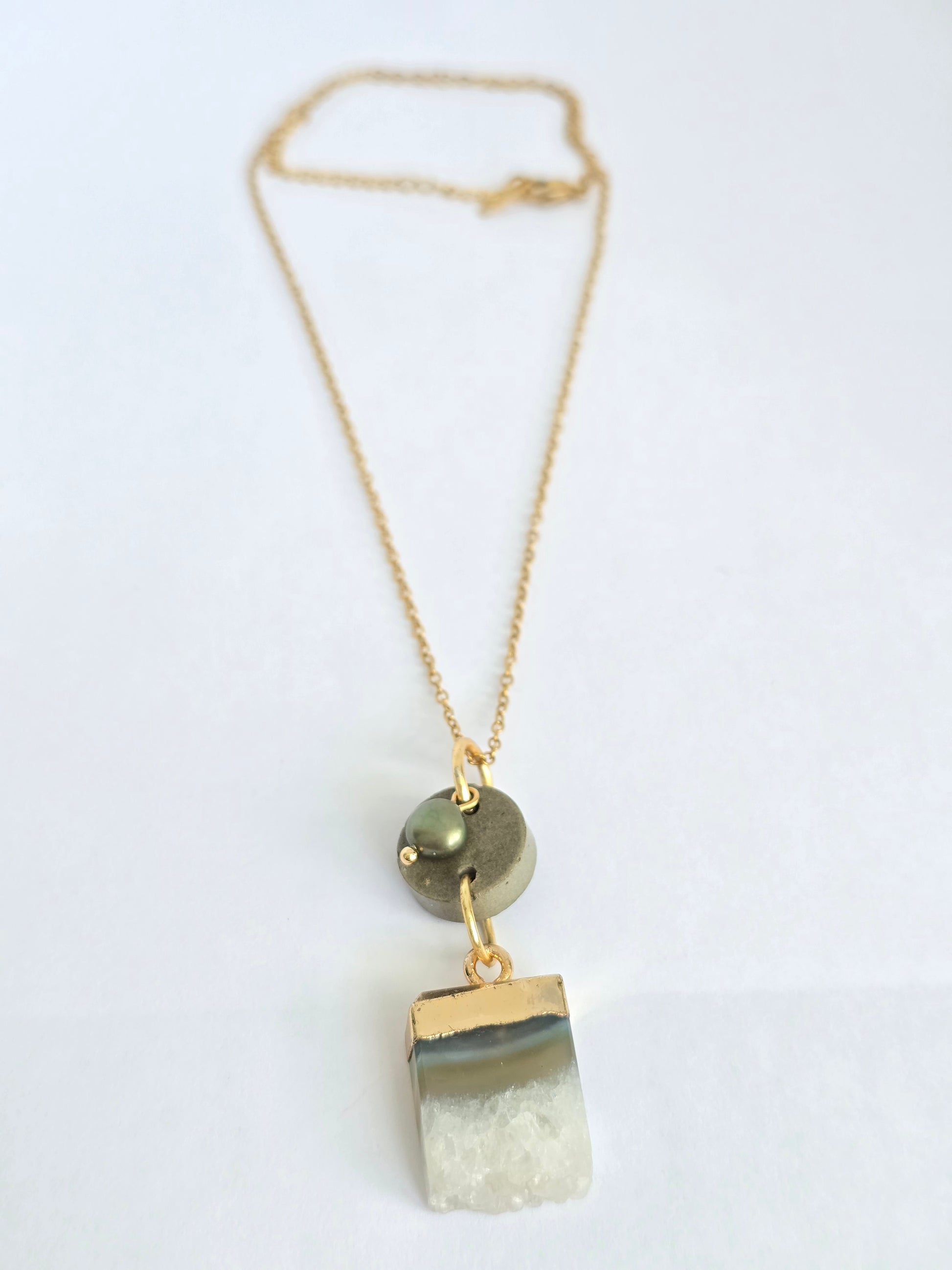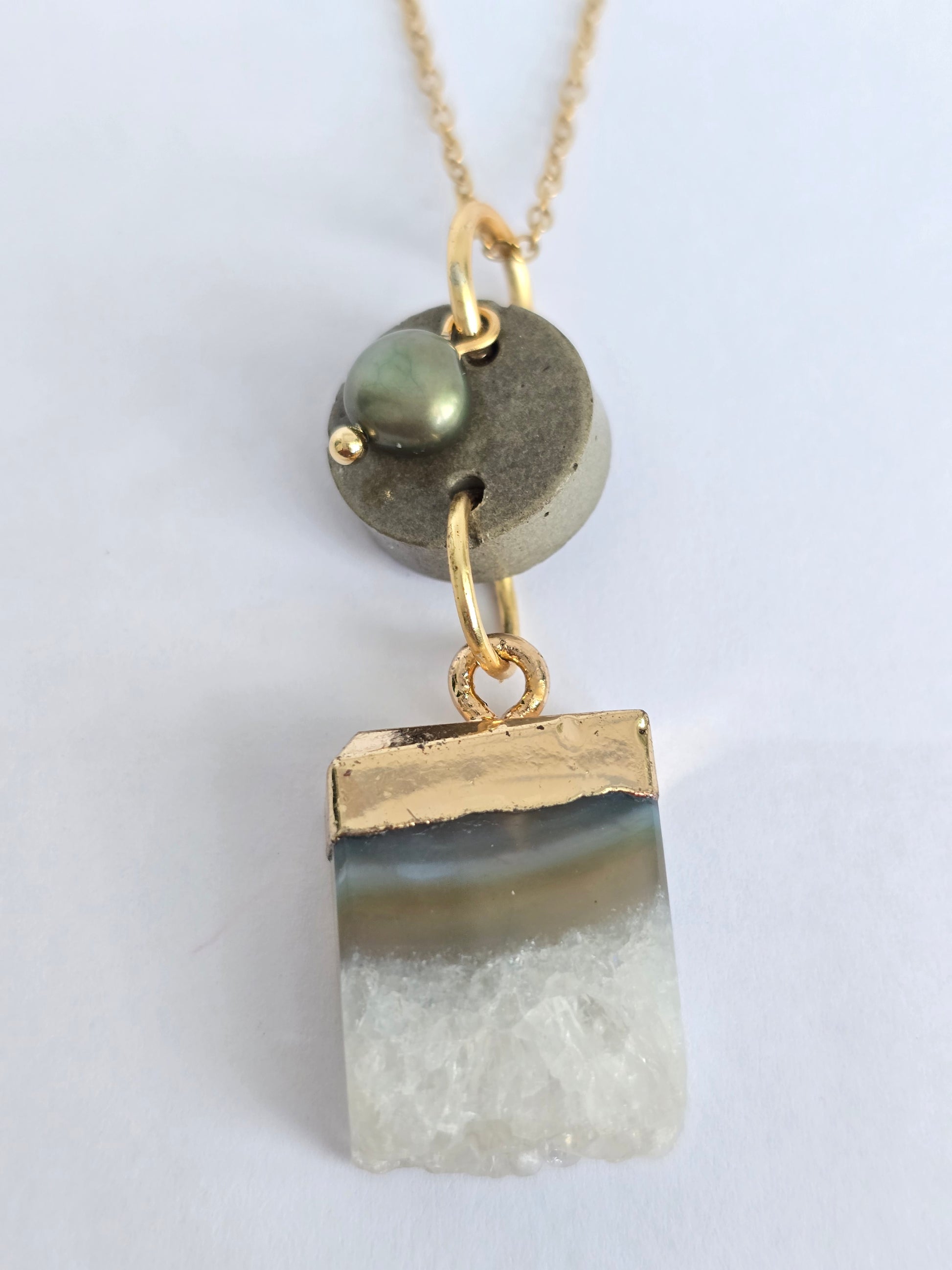 Diseño único con conector en cemento del que cuelga una hermosa piedra natural y una perla de agua dulce en tono verde. Una combinación de texturas y elementos que reflejan fuerza, elegancia y conexión con la tierra. Cadena en acero inoxidable, ideal para un look artesanal y sofisticado.