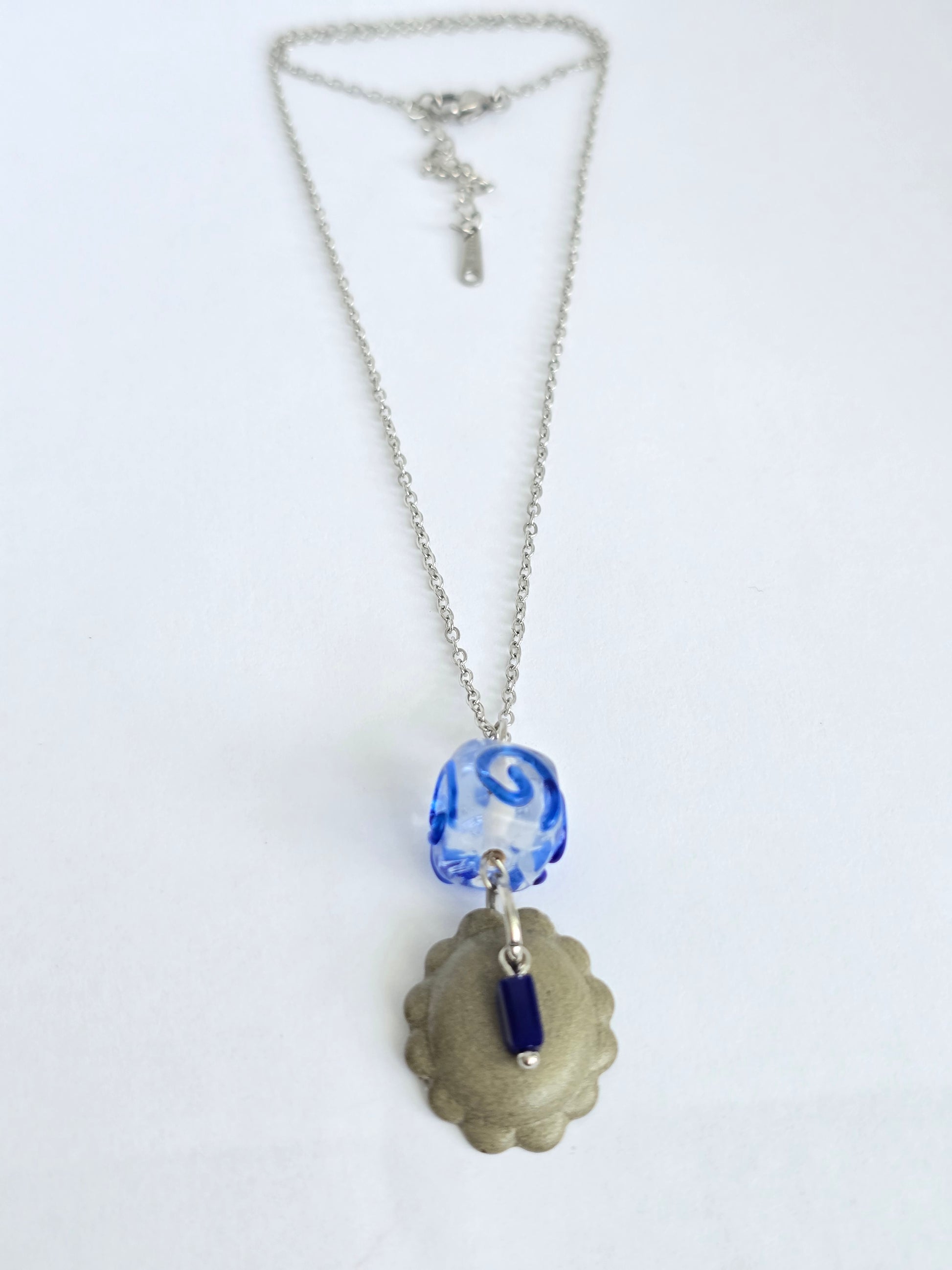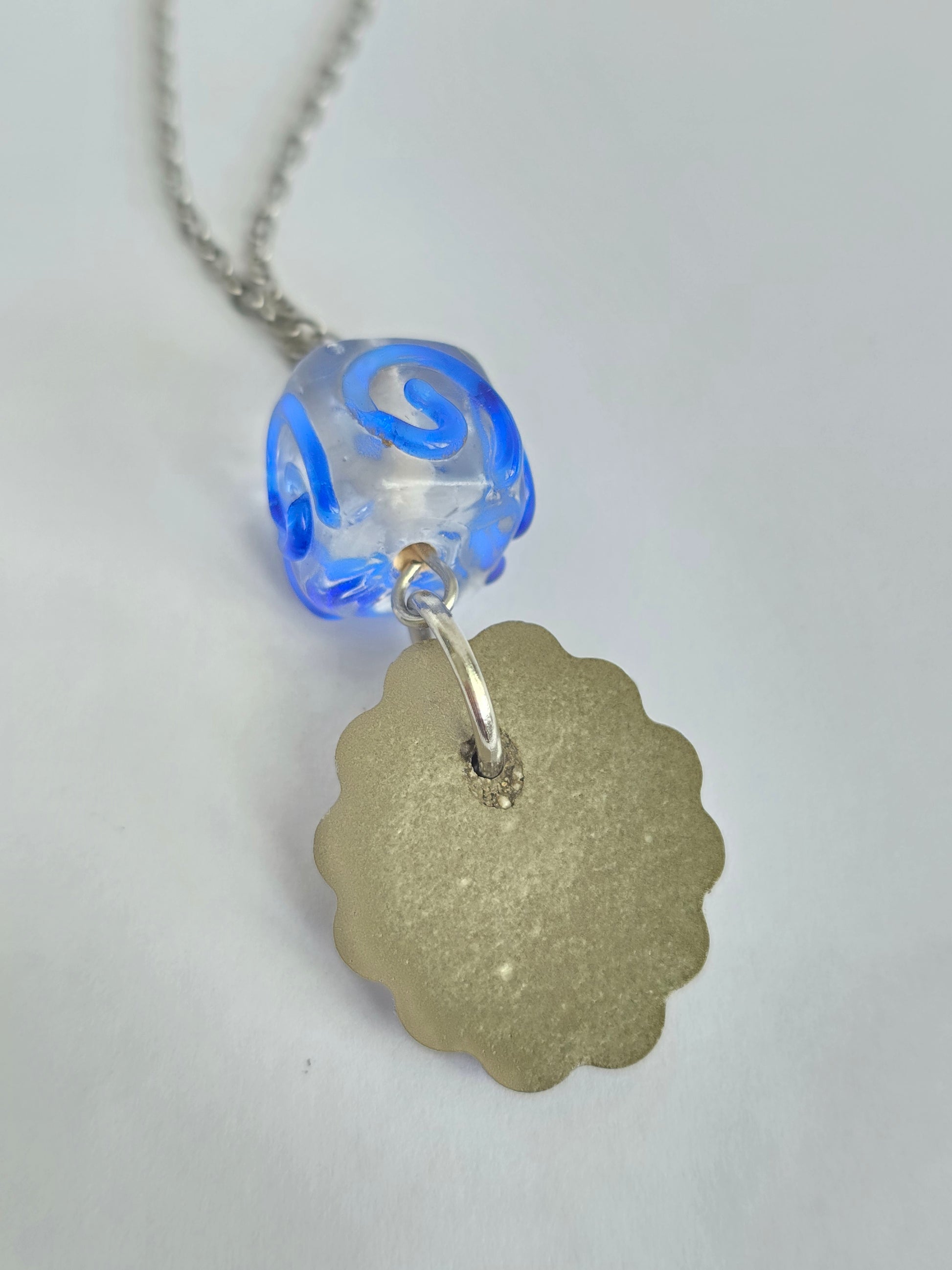 Colgante en cristal lampwork transparente con un delicado detalle azul, del que cuelga una pieza de cemento hecha a mano. Cadena en acero inoxidable, resistente y perfecta para uso diario. Una joya que une lo artesanal y lo artístico en una sola pieza elegante y original