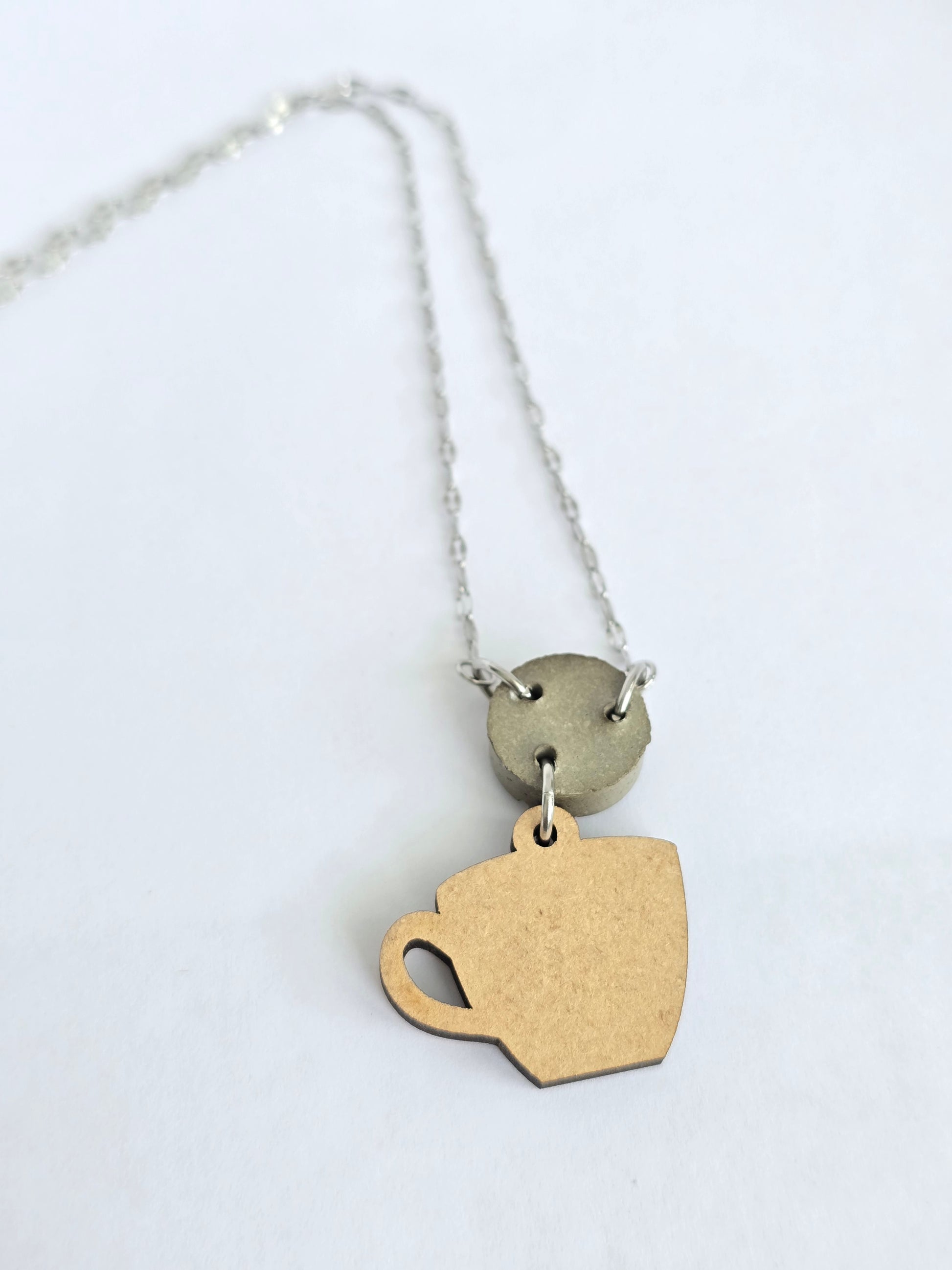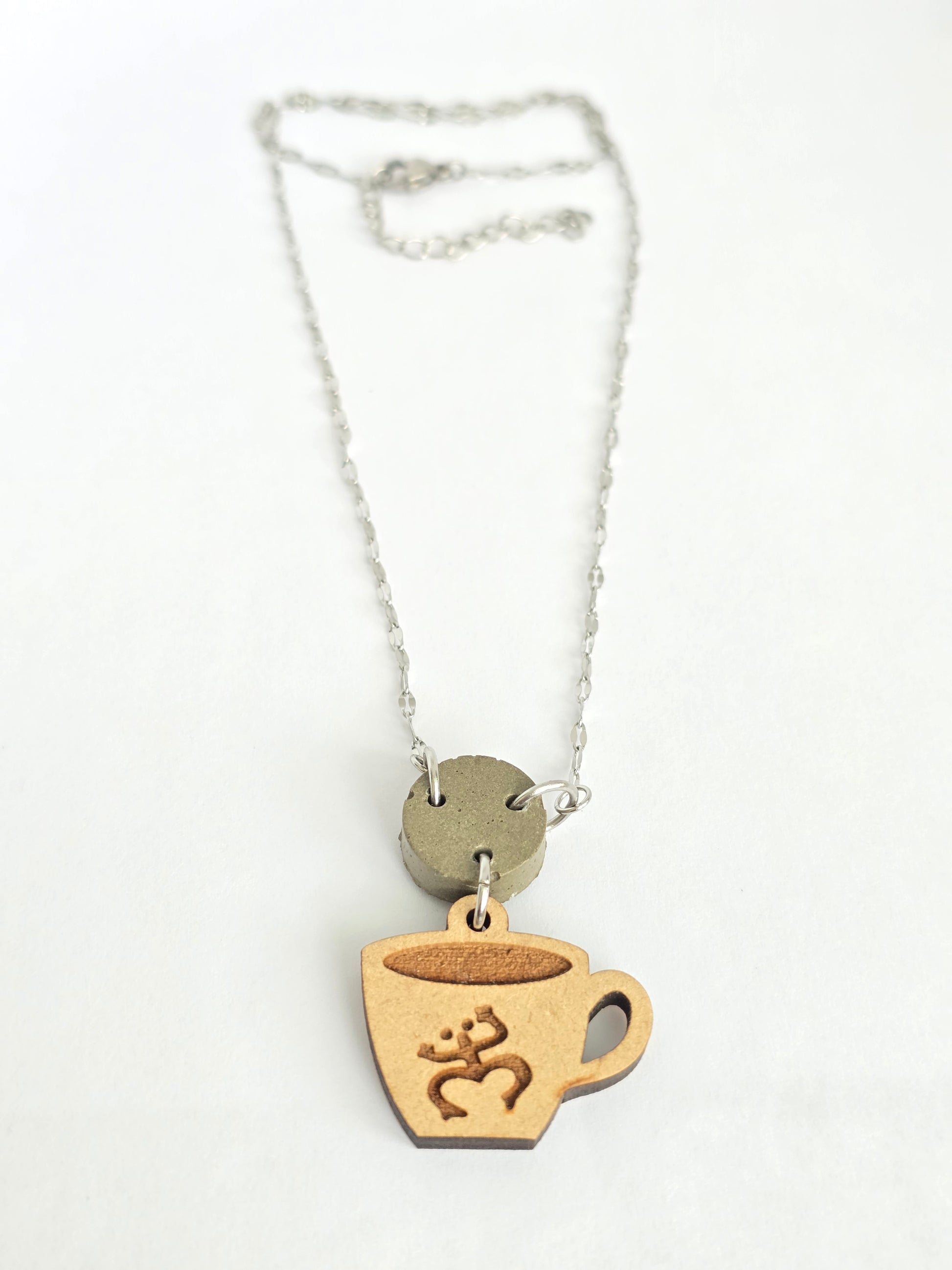 Esta exquisita pieza combina la rusticidad de la madera con la delicadeza del cemento. La taza de madera presenta un diseño único, inspirada en la cultura autóctona de la isla. El pequeño dije de cemento, con su intrincado detalle, complementa la estética general. La cadena de acero inoxidable asegura durabilidad y un toque moderno para lucir.