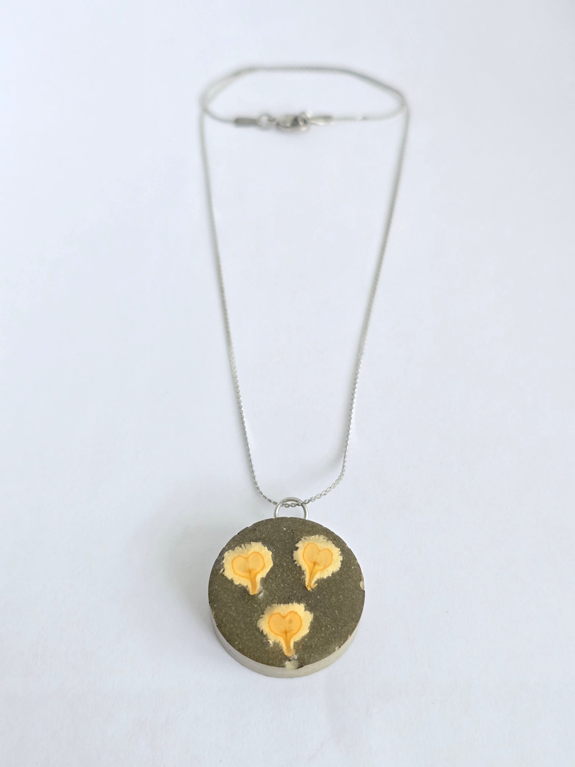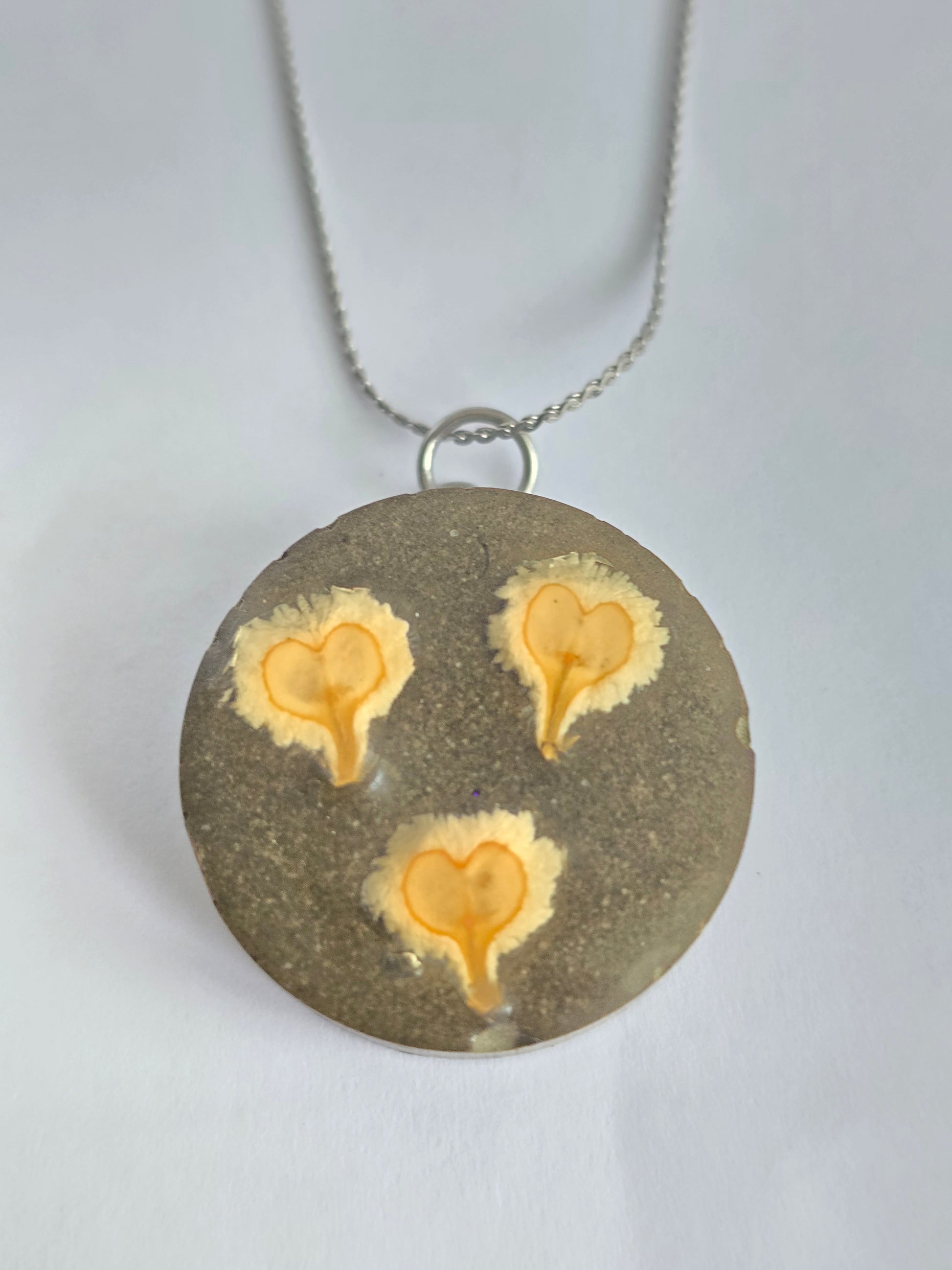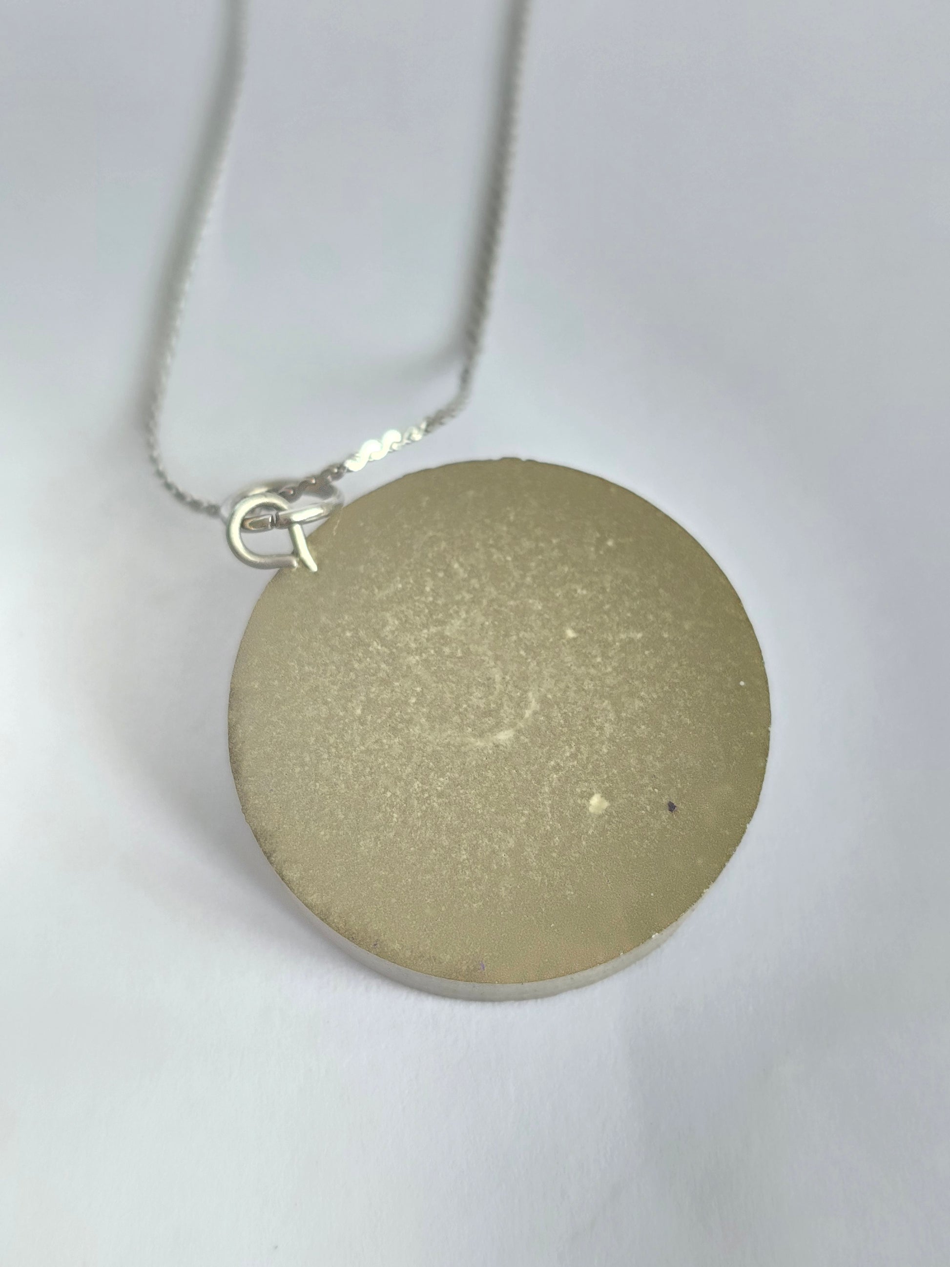 Colgante circular hecho en cemento con tres semillas del árbol conocido en Puerto Rico como meaito, encapsuladas en resina transparente. Cadena en acero inoxidable, resistente y cómoda para el uso diario. Una joya artesanal que celebra la naturaleza boricua y la belleza de lo hecho a mano.