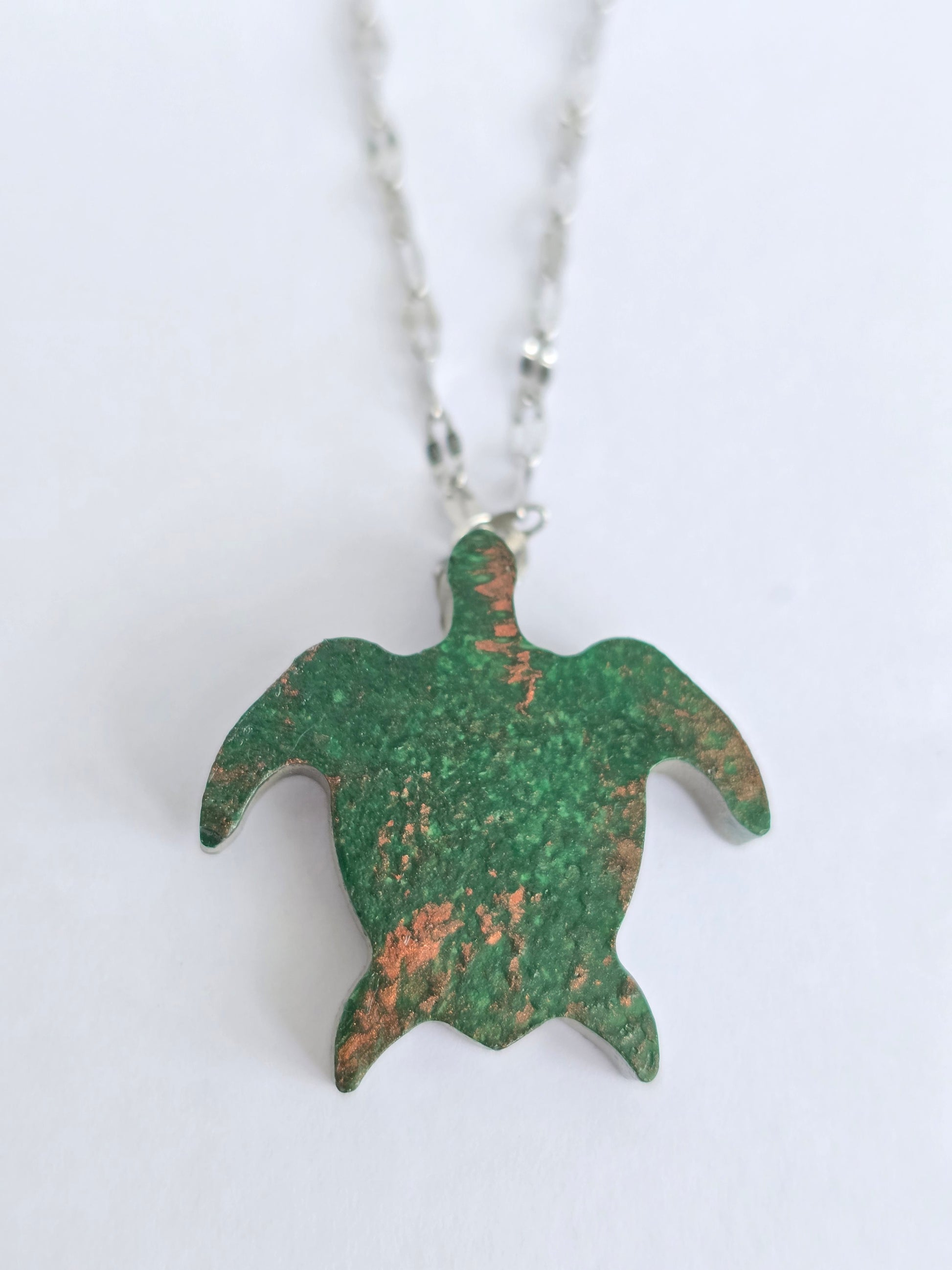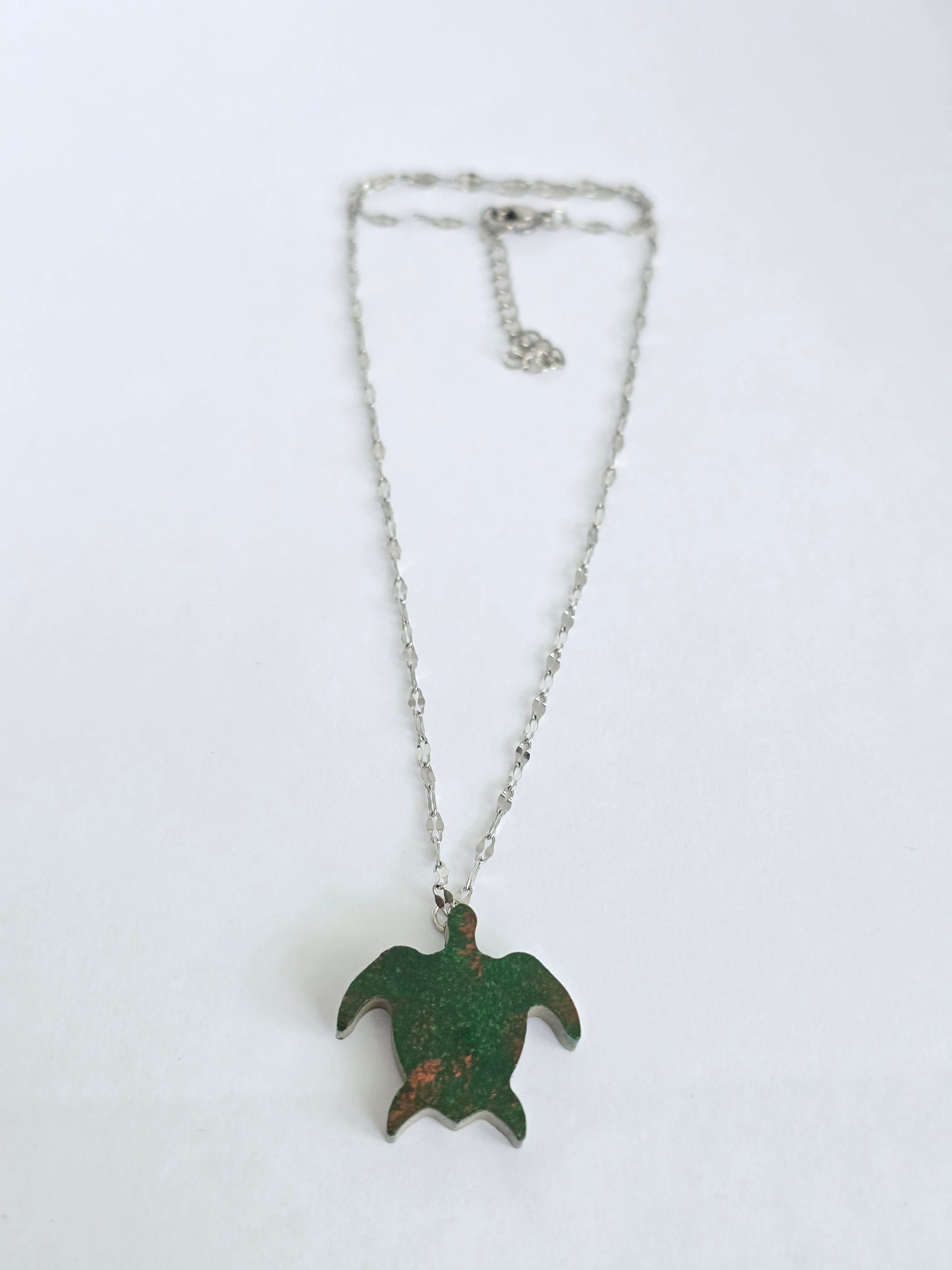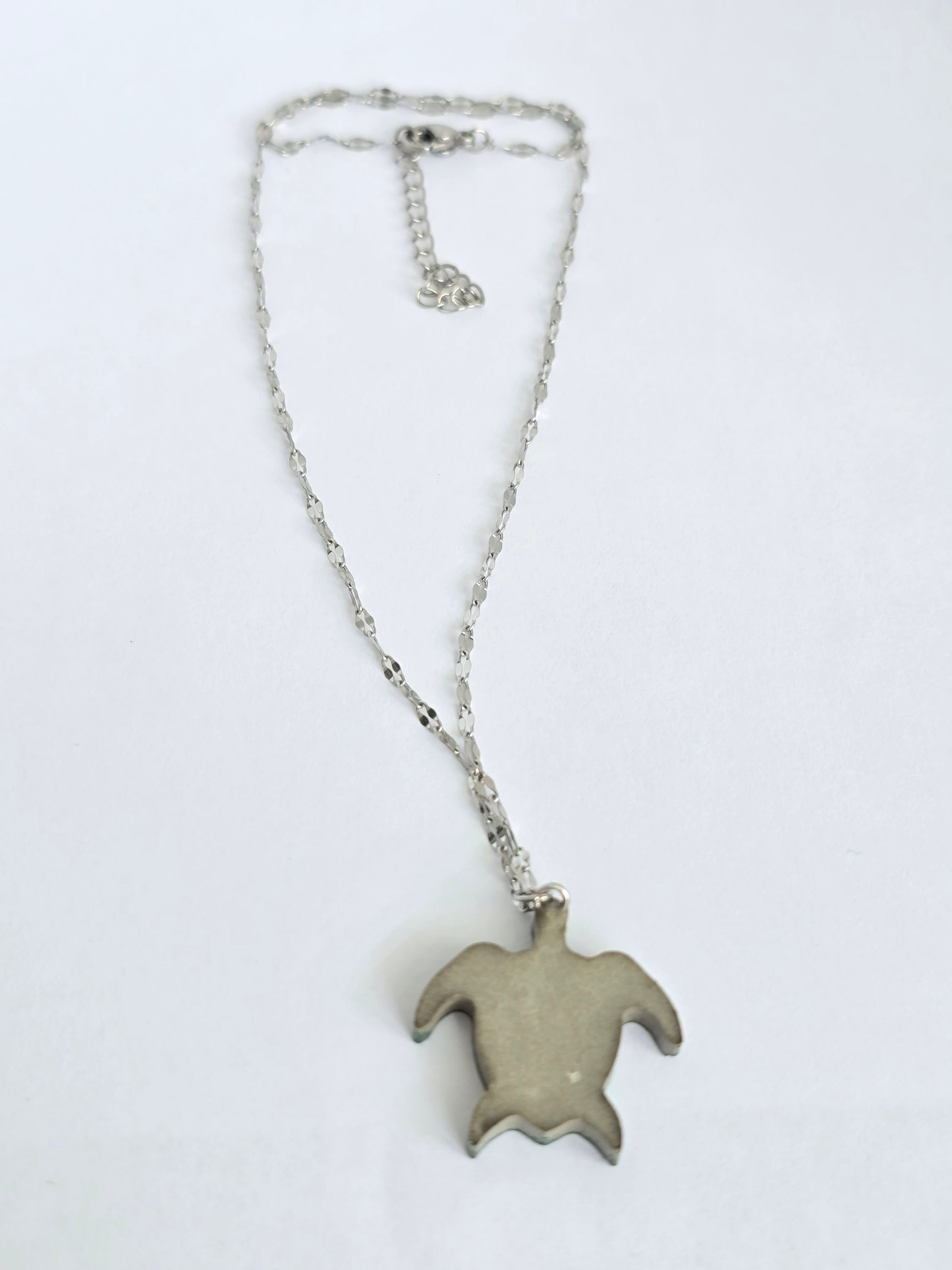 Colgante en forma de tortuga, hecho completamente en cemento y colocado directamente en una cadena de acero inoxidable. Un diseño minimalista y artesanal que simboliza paciencia, sabiduría y conexión con la naturaleza. Ideal para uso diario y amantes de los animales marinos.