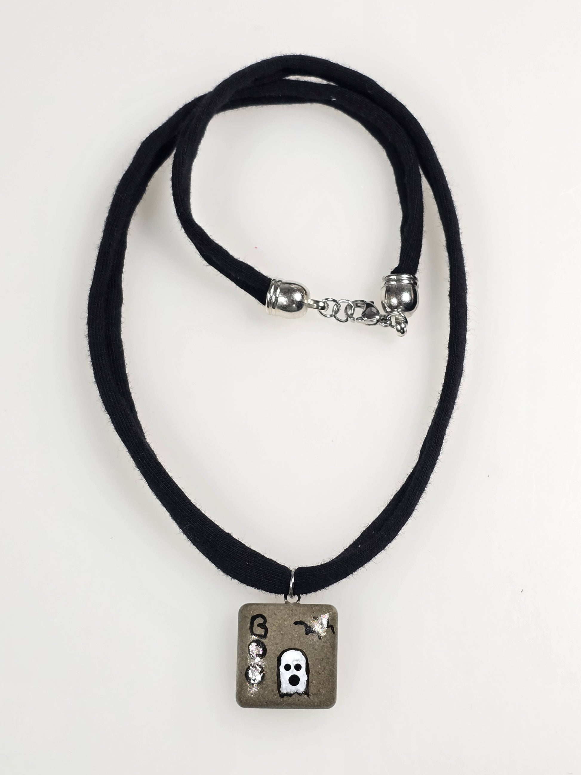Este collar hecho con hilo negro resistente.Terminación en acrílico plateado con cerradura de acero inoxidable, hipoalergénica y duradera. Pieza central en cemento con forma cuadrada, pintada a mano con un fantasma 👻 y detalles únicos. Un accesorio artesanal que combina la fuerza del cemento con el arte pintado a mano, perfecto para la temporada spooky.