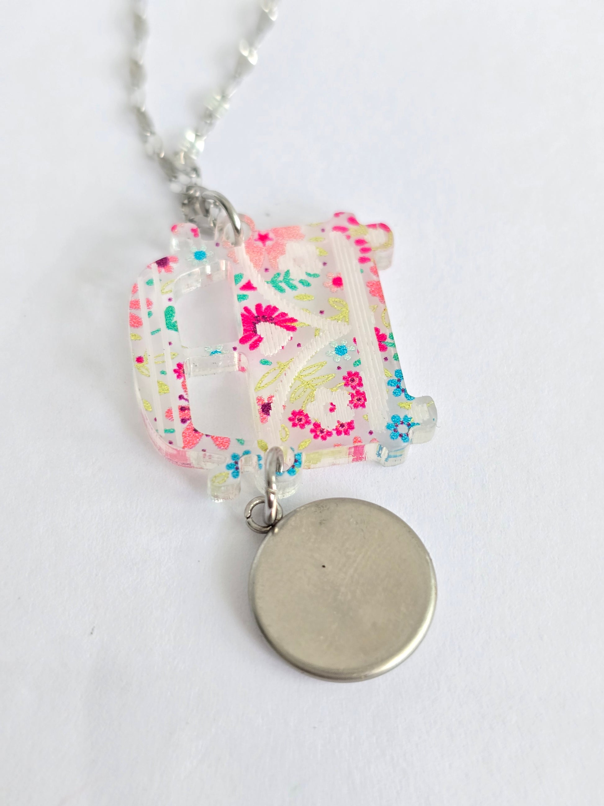 Colgante de acrílico con diseño de Volkswagen decorado con flores, del que cuelga una chapa de acero inoxidable rellena de cemento y una flor pintada a mano. Cadena en acero inoxidable, resistente y lista para acompañarte todos los días. Una pieza divertida, original y llena de detalles artesanales.