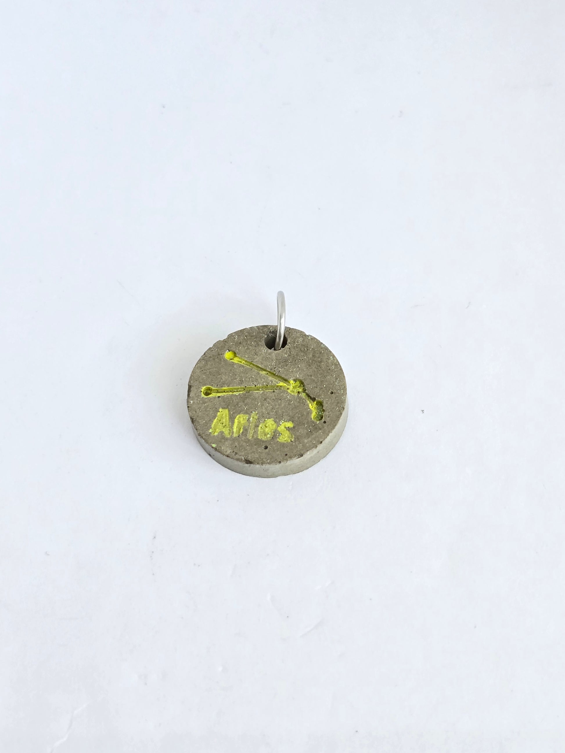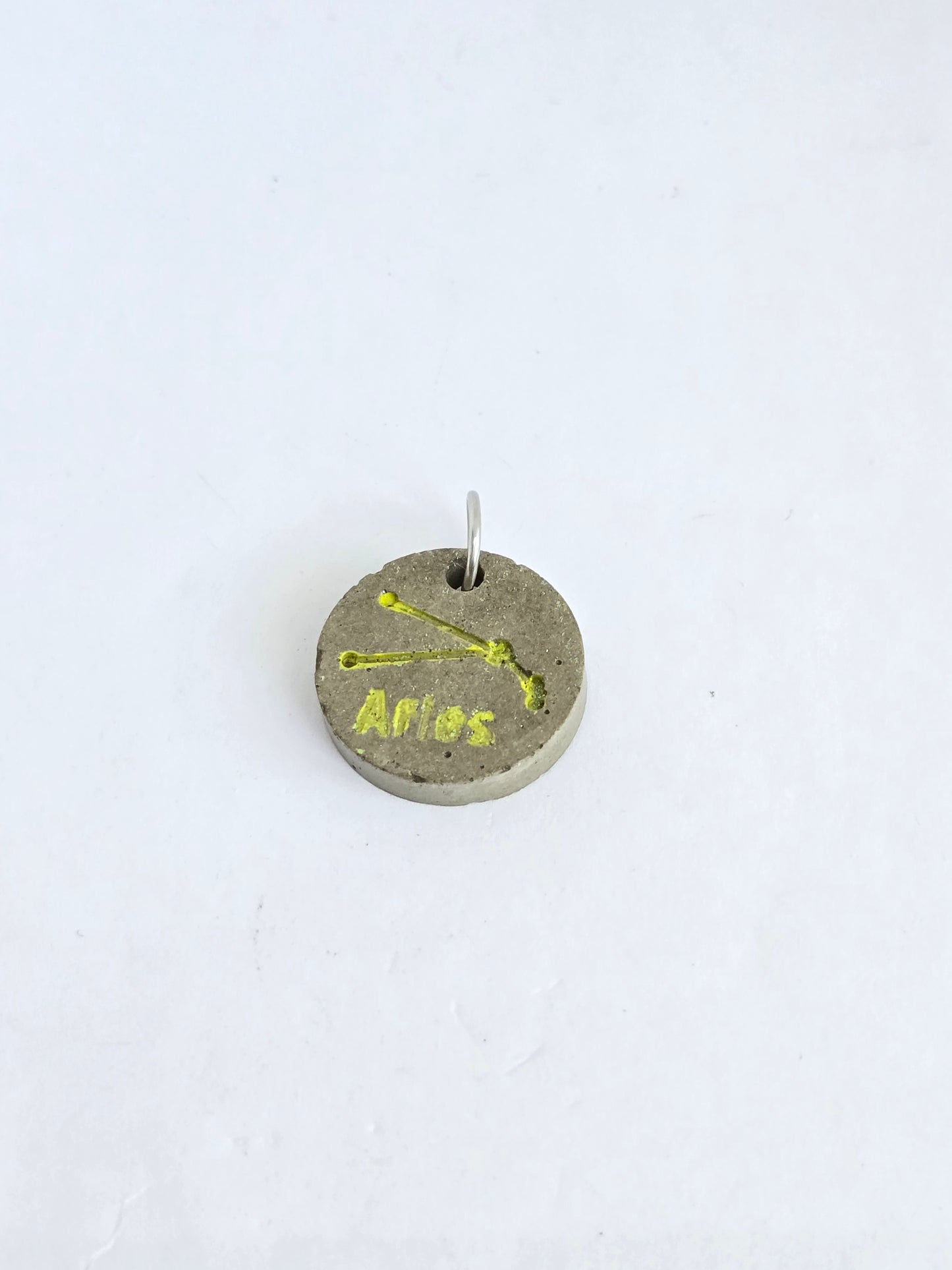 Charm del signo Aries, hecho en cemento y pintado a mano en tono amarillo. Un diseño vibrante y lleno de energía, ideal para reflejar tu pasión y valentía en collares, pulseras o llaveros.