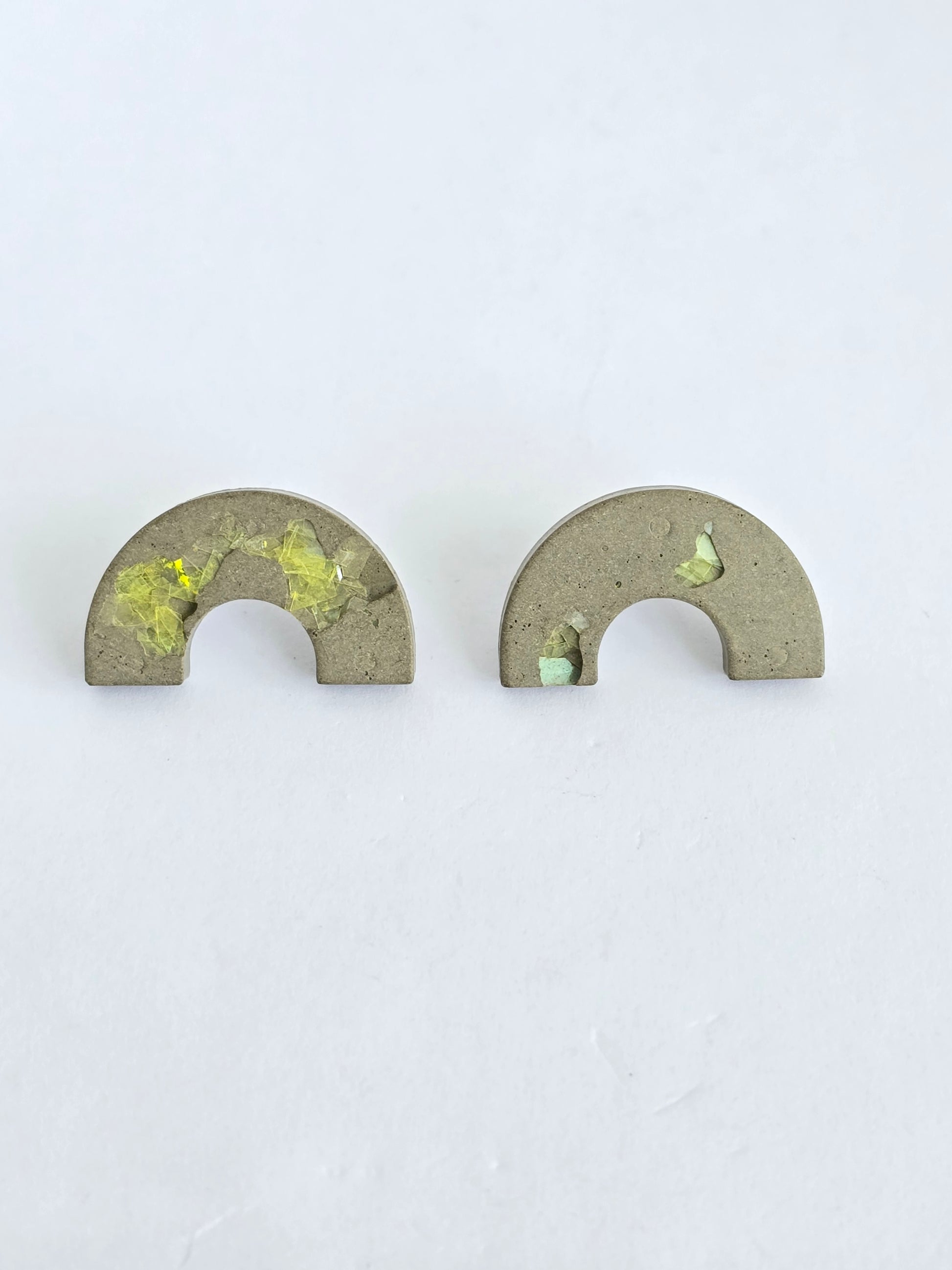 Pantallas pegaditos con diseño en cemento y detalles de fleco amarillo incrustado. Ligeras, originales y con parte trasera en acero inoxidable. Perfectas para un toque divertido y colorido en tu día a día.